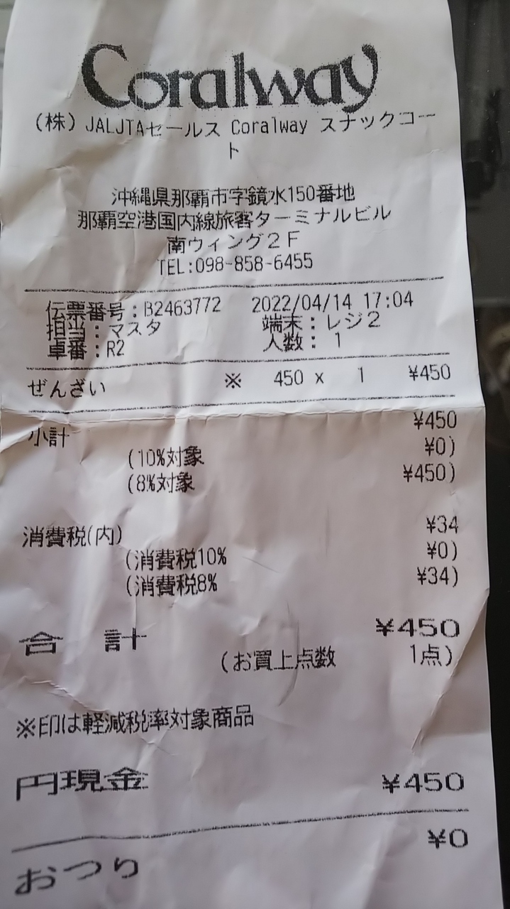 南ウィング2階。JALとJTAが運営するスナックコート。町中には無いのかと探したが無いらしい。あとは石垣島にある。島内でも美味しいぜんざいの有名店もありますが、コーラルウェイのはティクアウトでカップに入っています。初めはバカにしていたのですがとんでもない。しっかりと大粒の小豆が沢山入り白玉も沢山入っています。2、3個じゃなく沢山。シャキシャキした氷と甘すぎない絶妙な美味しさです。それで税込み450円です。ぜひぜひ町中にも店がほしい。全国のワシタショップにも置いてほしい位。有楽町のJALプラザにも羽田空港にも置いてほしい。ぜひ食べてみてください。なんと言う事か。写真を撮るのを忘れて食べてしまいました。仕方がないのでレシートだけ。