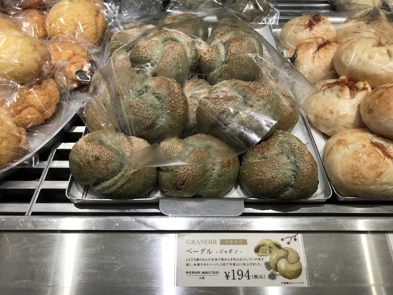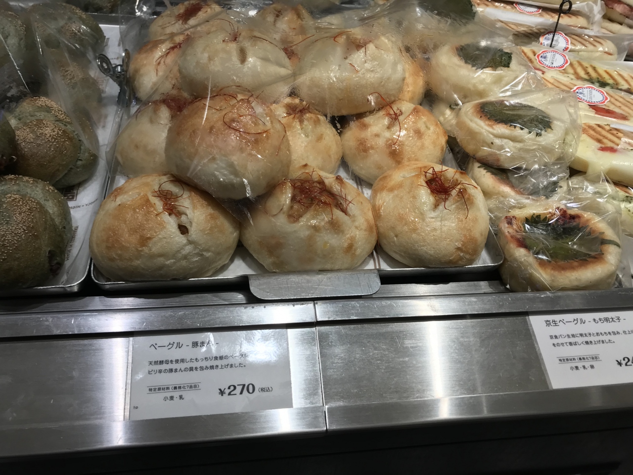 グランディール 京都は、JR京都駅烏丸東改札口出てすぐ近くにあります。店内をのぞくとベーグルの種類が豊富。おかず系とスイーツ系があり、おかず系は明太子、キーマカレー、ソシソンなど。スイーツ系は小倉&きな粉、チョコ、クランベリーとクルミなどがありました。今回豚まん、クランベリーとクルミ、ジャポンのベーグル3種類を購入。もっちりした生地が特徴的でどれもおいしかったです。美味しそうなパンがたくさんあり、どれを買おうかと迷ってしまうほどでした。