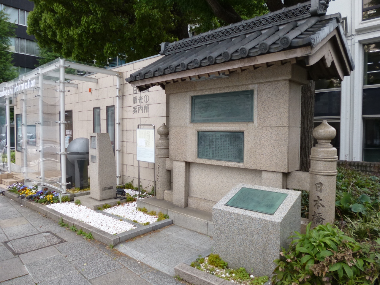 日本橋の南西詰めに「日本橋由来記の碑」があります。石碑にはレリーフが埋め込まれ、瓦屋根が設けられており、とても風格があります。すぐ脇には新しく日本橋観光案内所もオープンし、何度も通っている場所ですが、時間がある時はついつい足を止めたくなります。