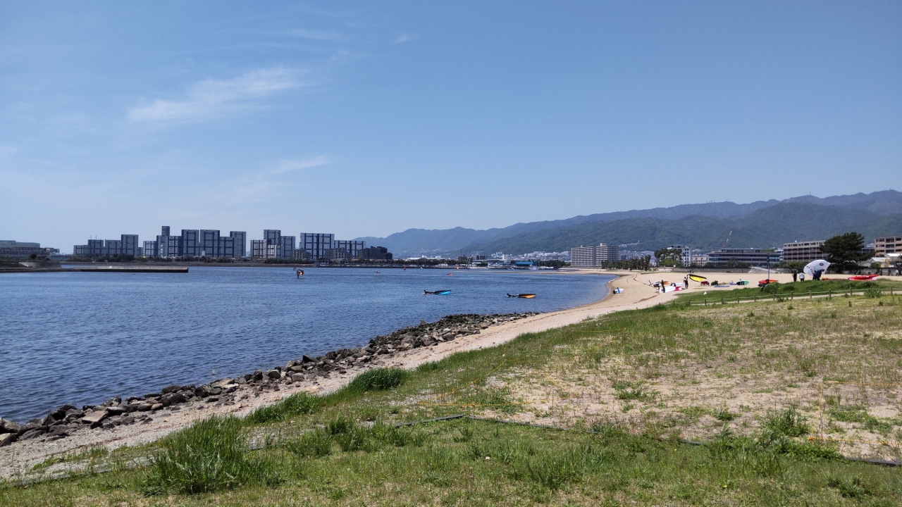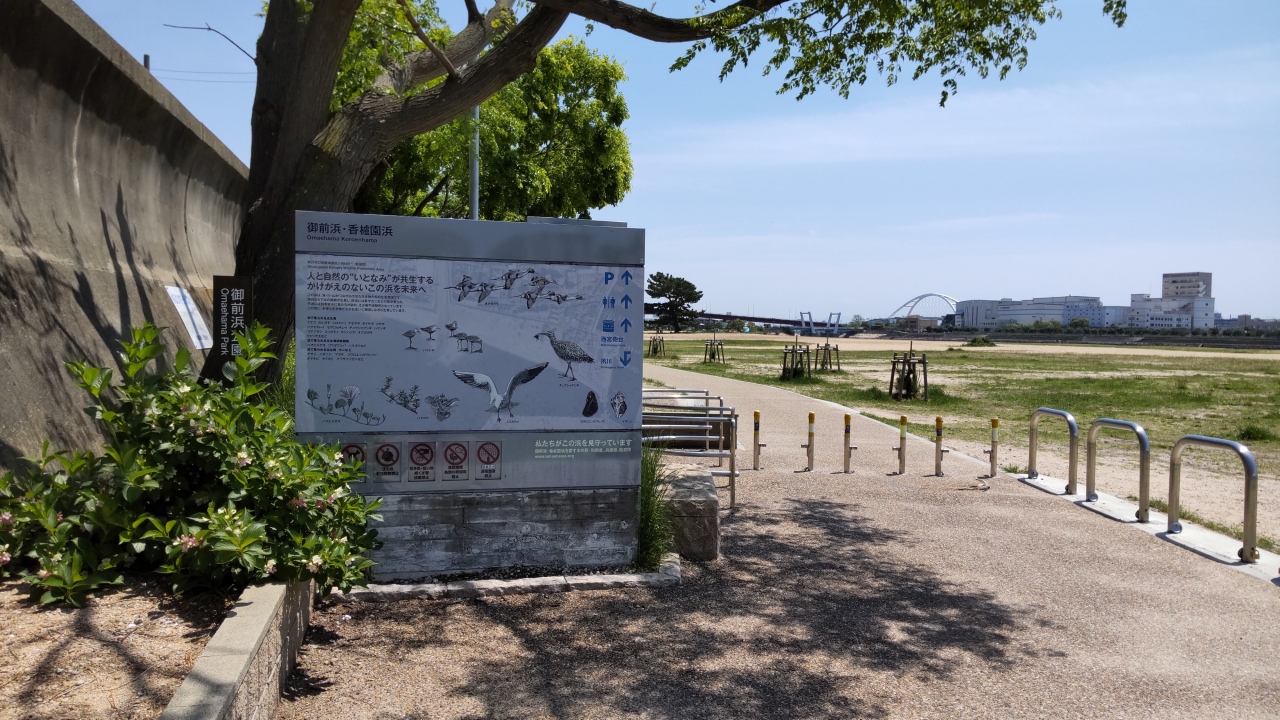 御前浜は、阪神香櫨園から南へ徒歩20分くらいのところにある自然海浜です。多くの渡り鳥、貝、カニ、海辺の植物を観察することができるスポットです。説明の看板もありました。興味がある方は看板を見てください。ゴールデンウイークに訪れました。ウインドーサーフィンを楽しんでいる人が数人いました。ここには、国の史跡となっている西宮砲台(江戸時代末期の海防の砲台)があります。