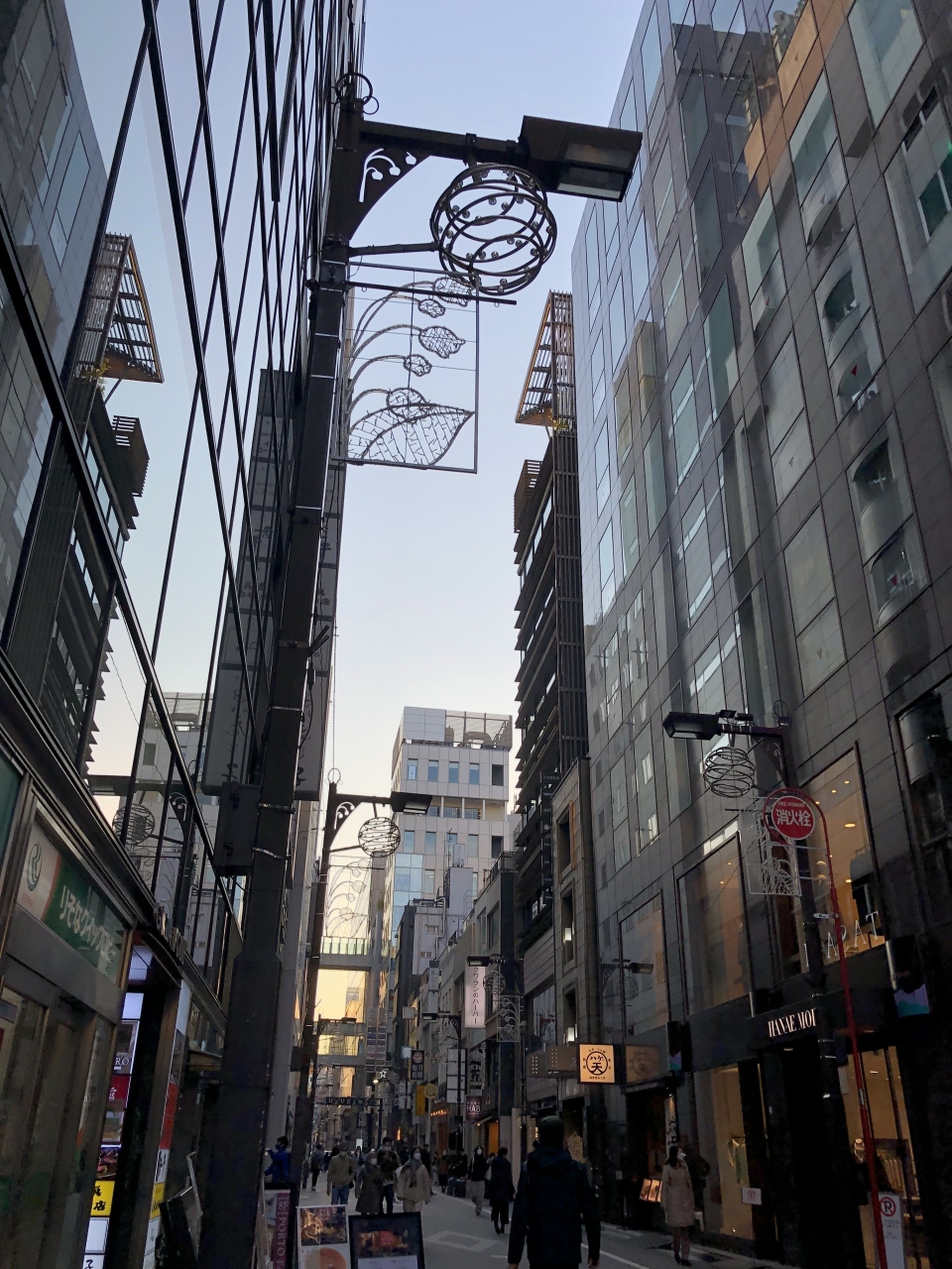 銀座中央通りから一本横に入った通りです。名前の通り、街灯がすずらんの形になっていてとてもかわいい。中央通りよりは人通りは少なかったですが、クリスマスイブということもあり、けっこう人はおおかったように思います。