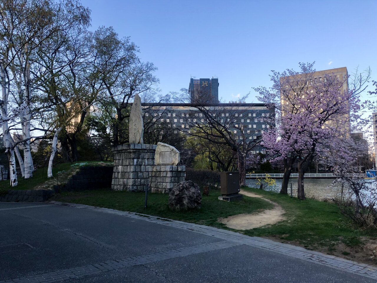 中島公園内を歩いていて、大小の石碑が並んで立っていました。調べてみると、札幌の開拓に当って尽力した4名の人物の功績を称えた「四翁表功之碑」とその副碑でした。明治維新いらい開拓の苦労を続け、尽力した、水原寅蔵、大岡助右衛門、石川正叟、対馬嘉三郎であり、その功労の碑だそうです。