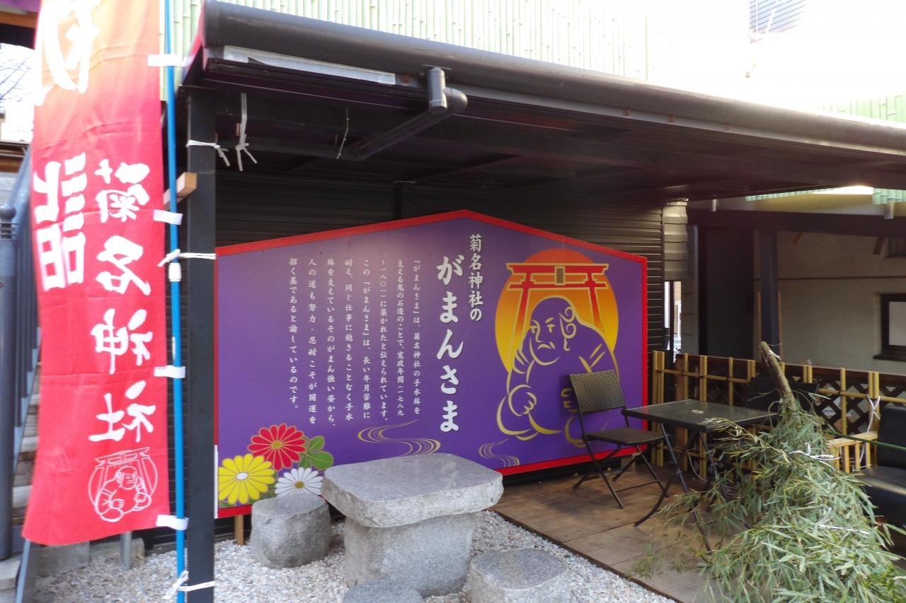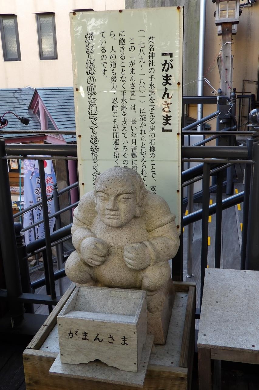 この「がまんさま」は、長い年月苦難に耐え、同じ仕事に飽きる事なく手水鉢をささえているそのがまん強い姿から、人の道も努力・忍耐こそが開運を招く基であると論している。