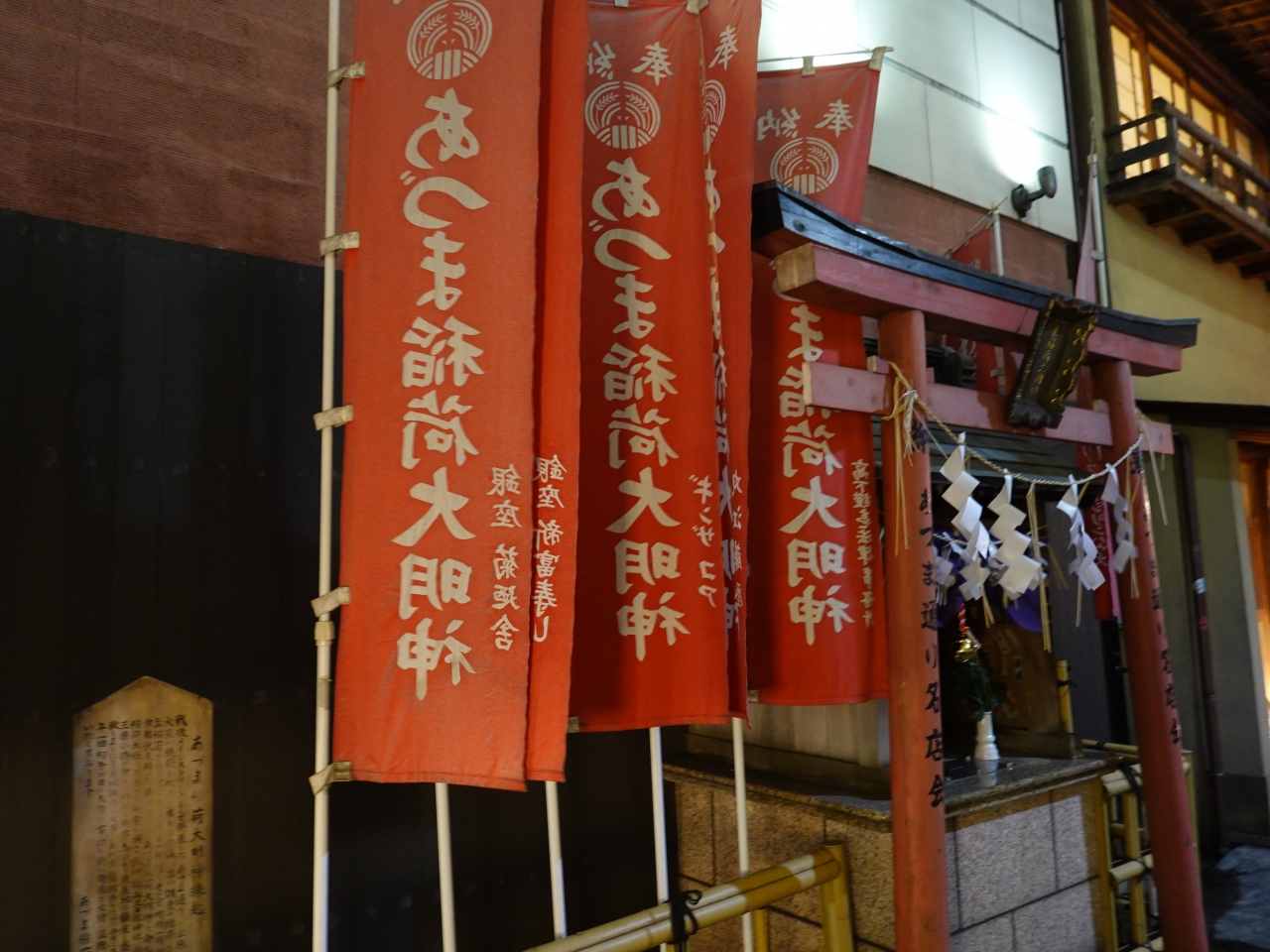 銀座の「あづま通り」と「三原通り」を結ぶ路地沿いにある小さな稲荷神社です。夕食後にホテルに戻る途中に立ち寄り参拝しました。飲食店の立ち並ぶエリアですが、喧騒とは無縁の世界で、暗がりの中に神社の淡い光が見え、訪れるたびにほっこりした気分になります。参拝される方には飲食業の方も多いと聞いたことがあります。早くコロナ後の日常が戻って欲しいと感じます。