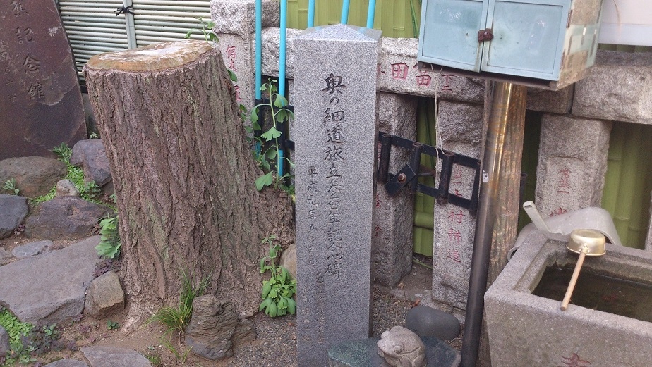 清澄白河駅から徒歩10分程度、江東区常盤1丁目の芭蕉稲荷神社内にあります。全国各地で行われた奥の細道紀行300年記念事業の一つとして平成元年に建立されたものです。狭い境内に【芭蕉庵跡】【芭蕉の句碑】【芭蕉生誕350年記念碑】【奥の細道旅たち300年記念】が立っていました。