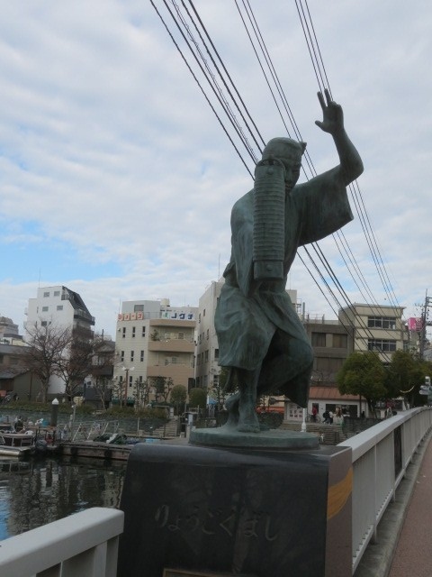 新町川に架かる橋で、欄干に阿波踊りを踊っている像があって、徳島を感じる場所です。結構迫力のある像です。こちらの橋が架かる川べりは、人が集まる場所になっていて、にぎやかな雰囲気です。徳島の人の社交場といえる場所なんですね。