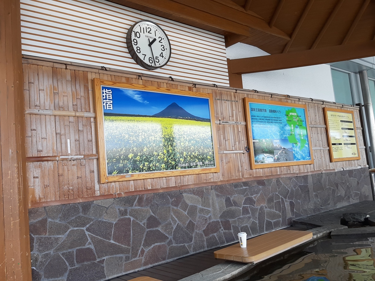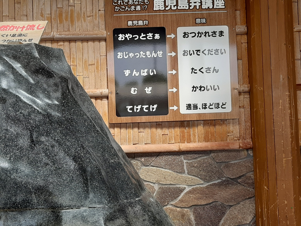 「おやっとさあ」は「あつかれさま」の方言だそうです。 桜島のオブジェがありました。 お湯の温度も丁度よくて、とても気持ち良かったです。 屋根は日が入るパネルで出来ていて明るく、すぐ横にタオルも置いてあって、セルフで200円で買えます。