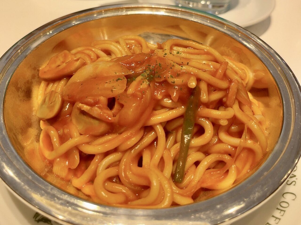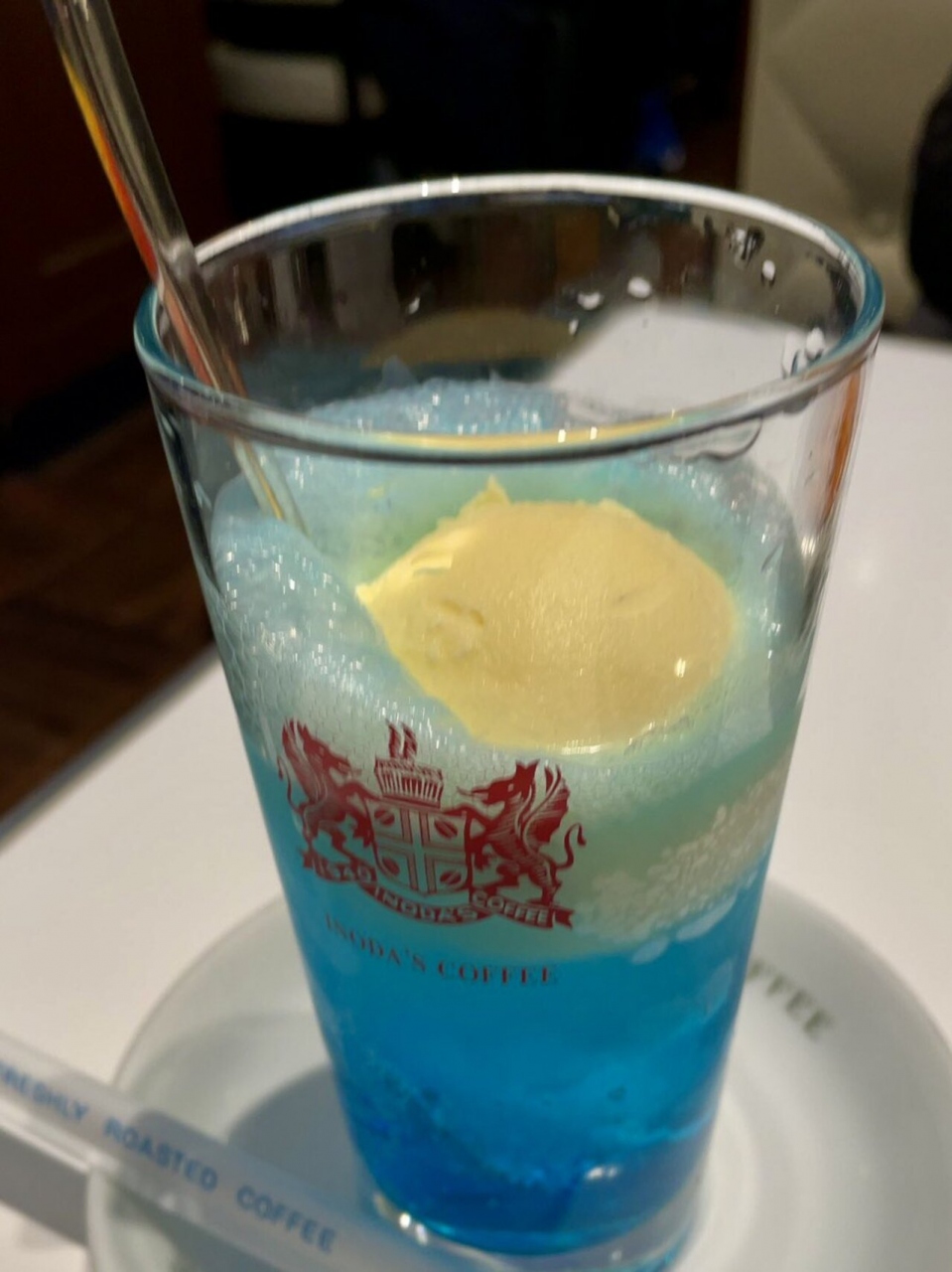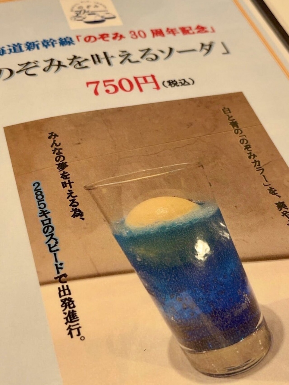 新幹線に乗る前に、イノダコーヒー八条口支店で、お昼ご飯。イノダコーヒーに入れば、必ず食べるイタリアン。いわゆるナポリタンスパゲッティなのですが、ここではイタリアンと呼びます。イノダ独特の香りと味のイタリアンはやみつきです。新幹線のぞみ開業30周年記念「のぞみを叶えるソーダ」も注文。