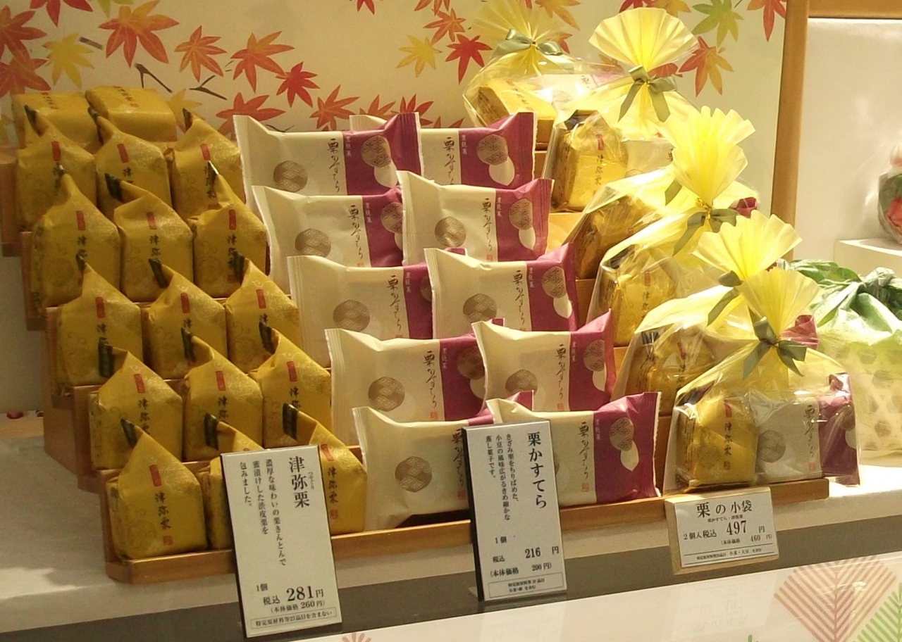 銀座松屋の地下食料品店フロアにある、和菓子の源吉兆庵のショップです。季節に合わせたお菓子が並ぶのが楽しみなお店ですが、ちょうど秋らしい栗のお菓子が販売されていました。津弥栗は、まるごとの栗を栗きんとんで包んだお菓子で、栗の味がぎゅっと詰まっていました。