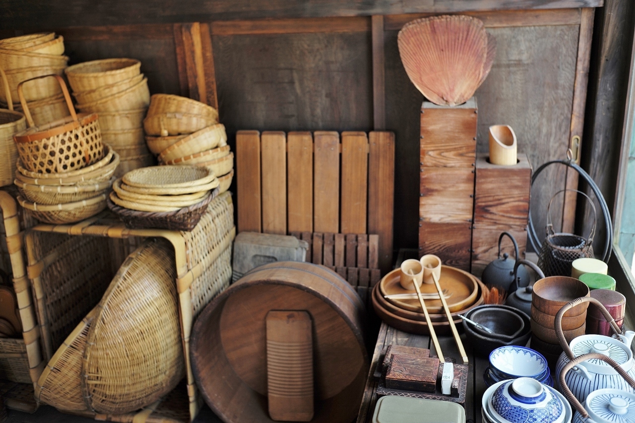 以前は町に一軒は必ずあった荒物屋さん、扱う商品はたわし,箒、鍋釜、瀬戸物、桶やざるなどなど