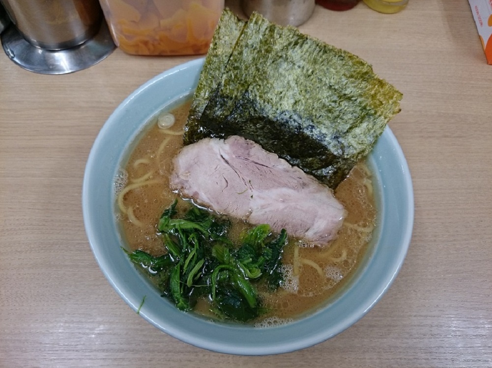 池袋駅西口の豊島区西池袋3丁目のマルイの裏側あたりにある横浜家系のラーメン屋さんです。夕食でらーめん並をいただきました。具は家系ラーメン定番の海苔、チャーシュー、ホウレンソウで、脂分の多い濃厚豚骨醤油スープと太めの縮れ麺の一品です。スープには豚骨独特のコクや臭いがあり私好みの味。美味しいスープの家系ラーメンでした。