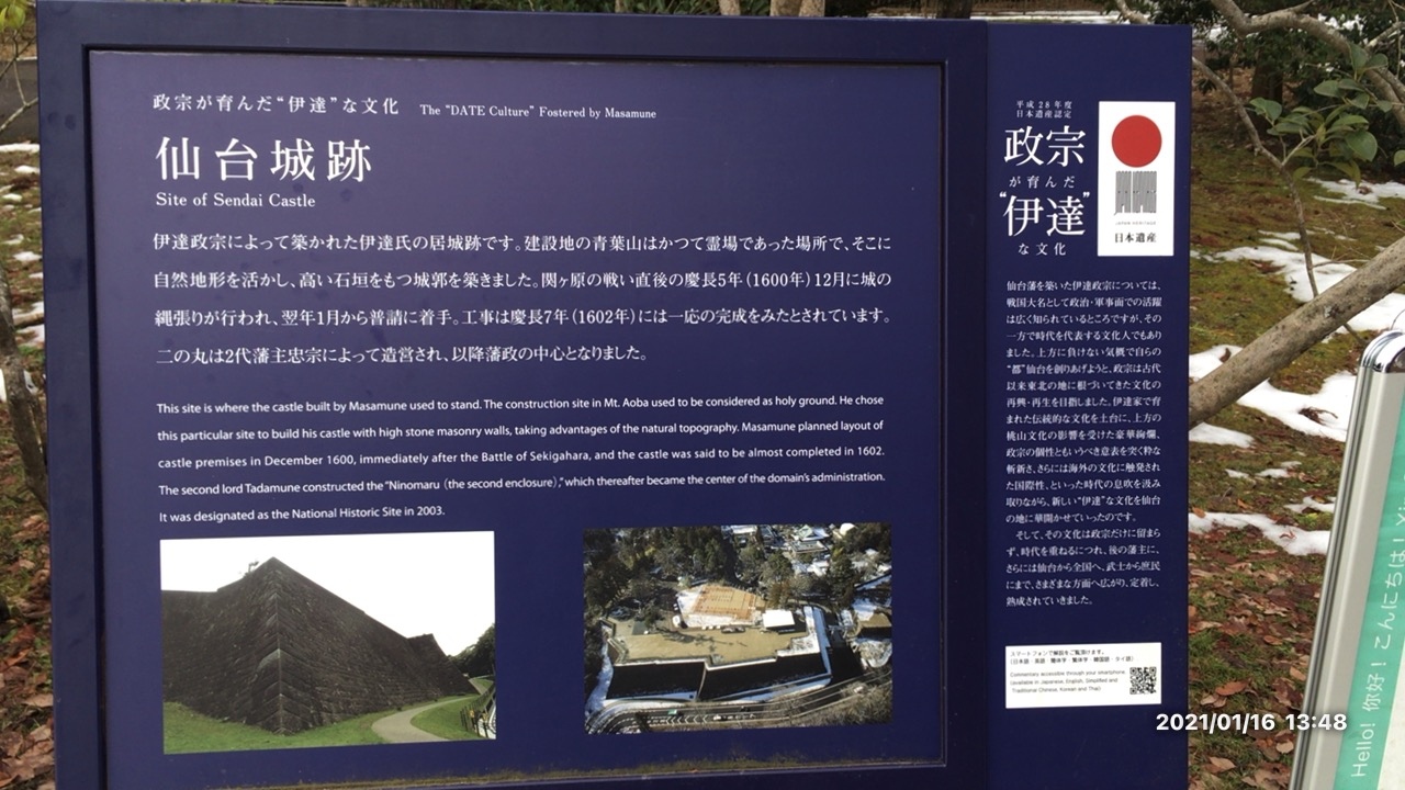 詳しく調べないで訪問した私が悪いのですが城はなく跡です。もちろん何もないわけではなく石垣は立派なものが既存であります。(地震の被害を受け現在は修復中)高台から見下ろす景色は昔の城主の見た景色と通じるものがあるなど歴史的な価値はある場所です。伊達政宗像もありますがこちらも地震被害でシートに包まれ見ることできませんでした