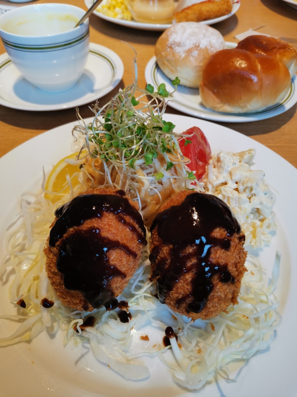 カニクリームコロッケを食べてきました。今まで食べたカニクリームコロッケの中で、一番蟹の身を感じられたコロッケでした。クリーミーでとても美味しかったです。パンとスープセットにして、焼き立てのパンをたくさん食べてきました。食べ放題なのでパン好きには嬉しい限りです。