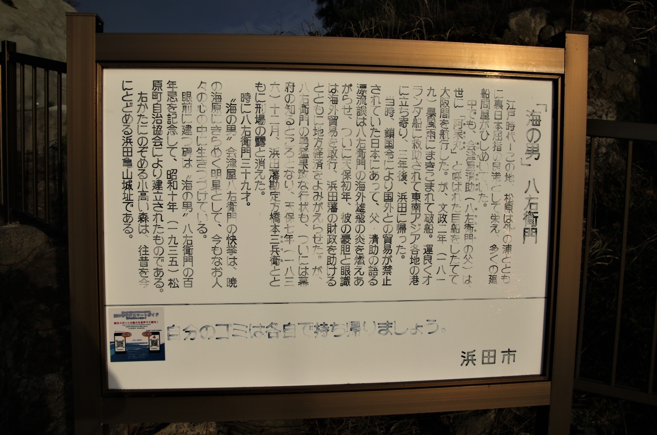 江戸時代海外との貿易で大赤字の浜田藩財政を立て直そうとした海の男会津屋八右衛門の顕彰碑です。藩士の知行借り上げや領民に対する年貢引き上げ、領民や藩士に節約を強いる倹約令などで藩財政を立て直そうとした多くの藩のようなことはせず海外貿易によって藩財政を立て直そうとした会津屋八右衛門は浜田では人気の高い商人です。
