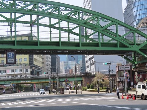 千代田区外神田一丁目・二丁目にある架道橋が松住町架道橋。神田川にかかる昌平橋は南を中央線、北を総武線に挟まれていて橋のすぐ北の昌平橋交差点の真上を総武線が走っています。両線はそのすぐ西側で合流し、御茶ノ水駅に入っていきます。この交差点で外堀通りは90度曲がるため、支間を広くとる必要があり、架道橋はとても立派なアーチ橋になっています。昌平橋そのものよりとても目立つ存在だと思います。