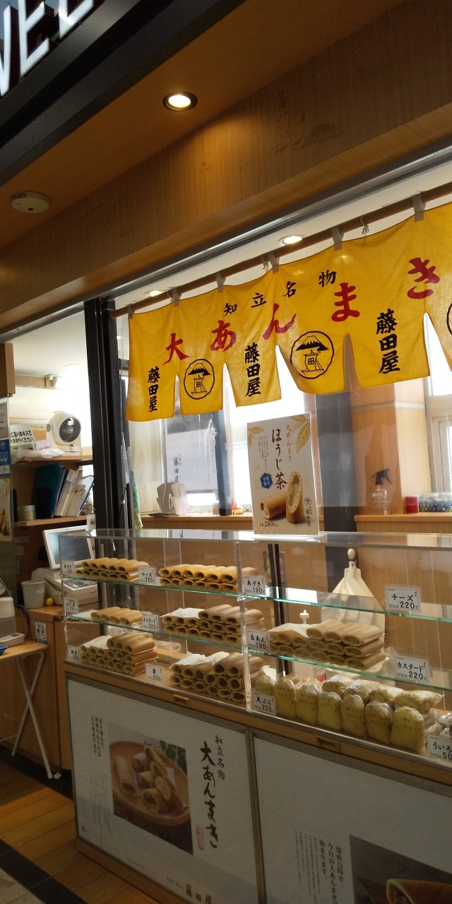 愛知県知立の名物「あんまき」を販売している藤田屋さんの豊橋駅構内のコーナーです。JR東海と名古屋鉄道の豊橋駅の改札の中にその店があり改札を抜けると目の前にあります。アンコをまいた薄皮のお菓子でやや塩気のある美味しいお菓子で割りとボリュームがあります