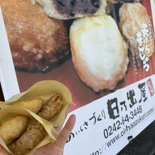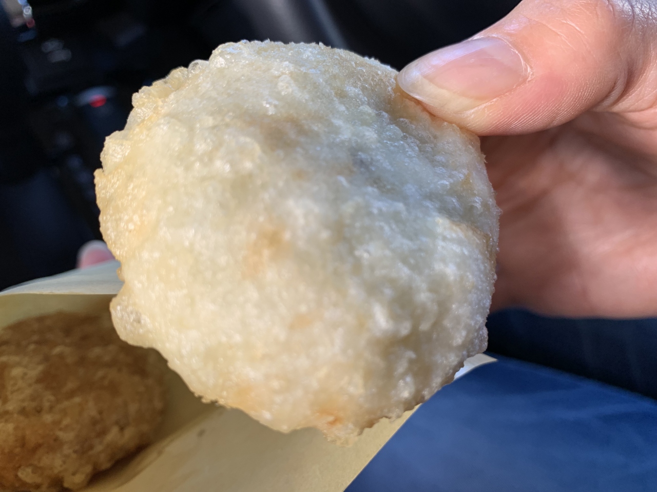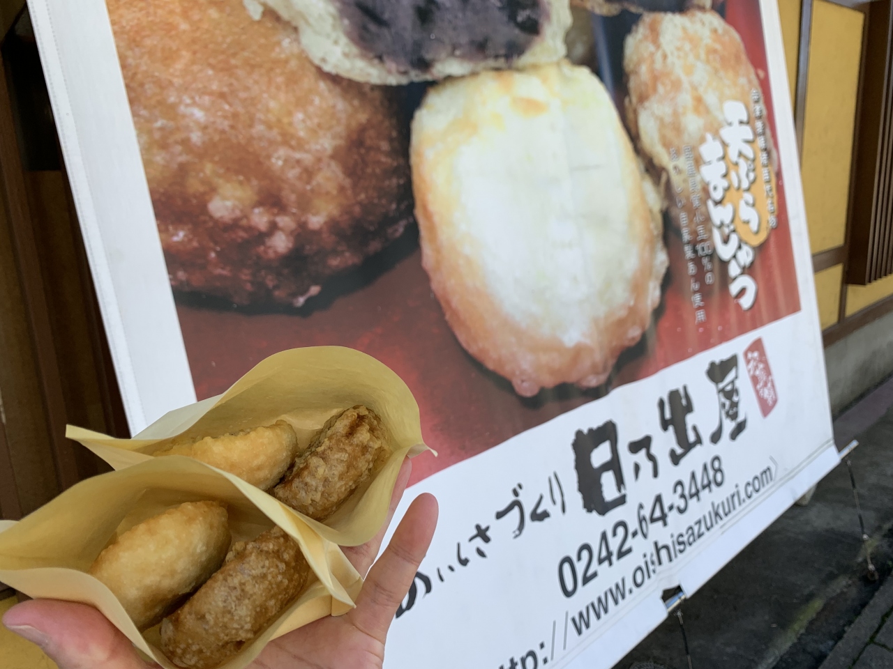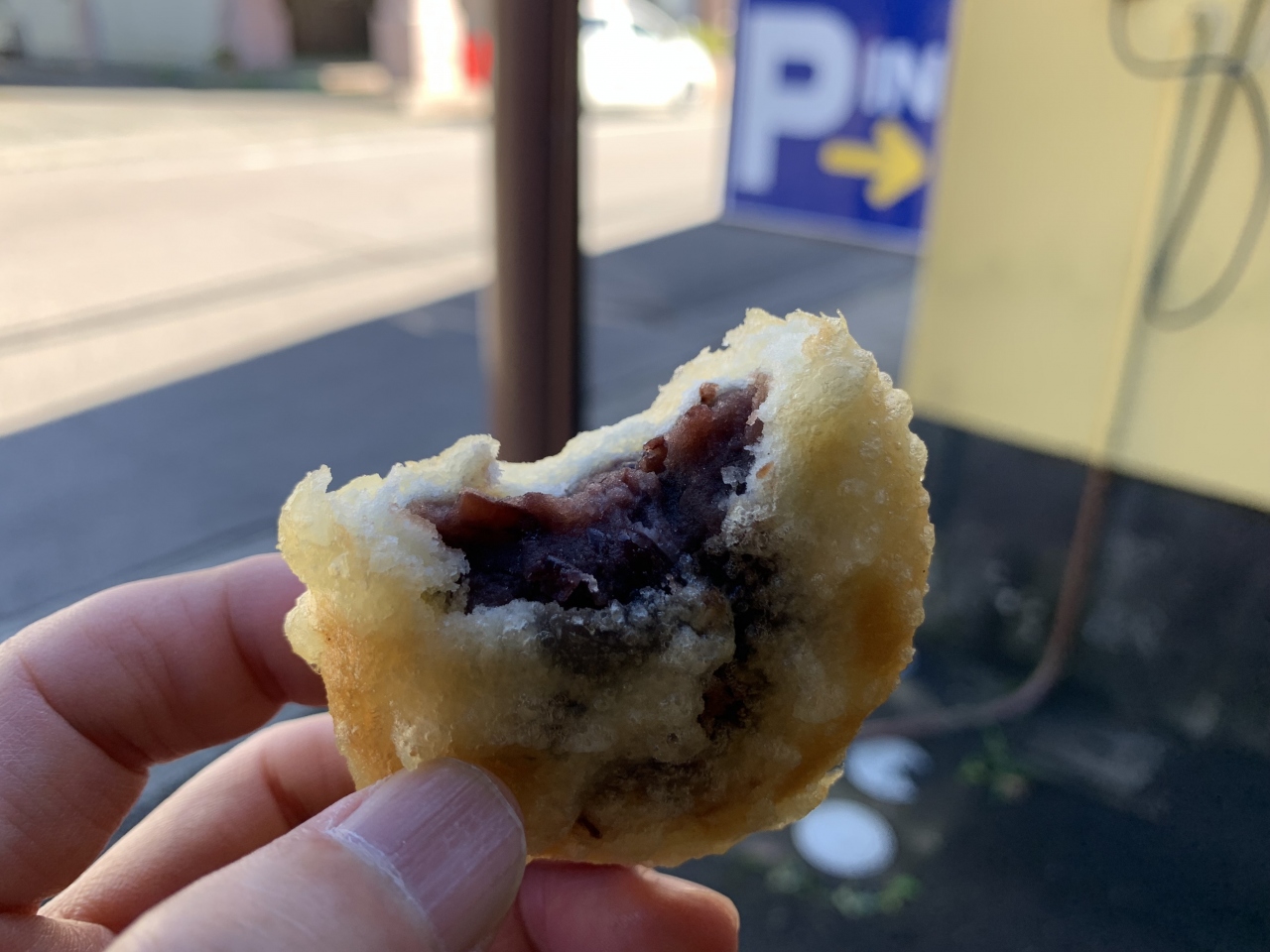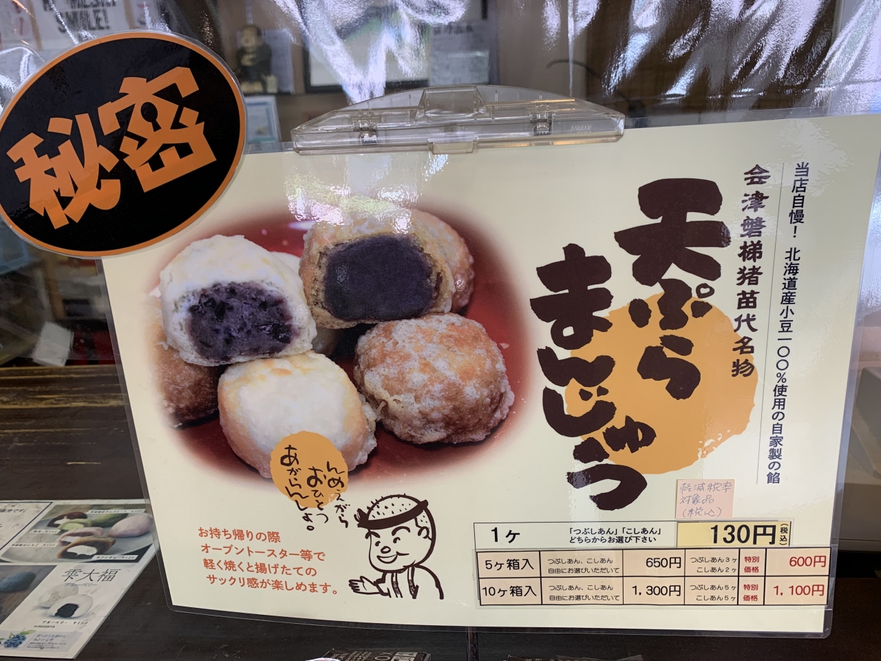 中ノ沢温泉街にある老舗の和菓子店です。近隣の温泉旅館に宿泊し、チェックアウト後に朝食後のデザートで立ち寄りました。いただいたのは名物の「天ぷらまんじゅう」、温泉まんじゅうの天ぷらです。揚げたてサクサク&熱々の衣の中に、自家製のあんこが詰まっていて、普通の温泉まんじゅうとは異なる重厚な味わい。小麦まんじゅうのつぶあんと、黒糖風味の皮の茶色いまんじゅうのこしあんの2種類、両方をいただきました。