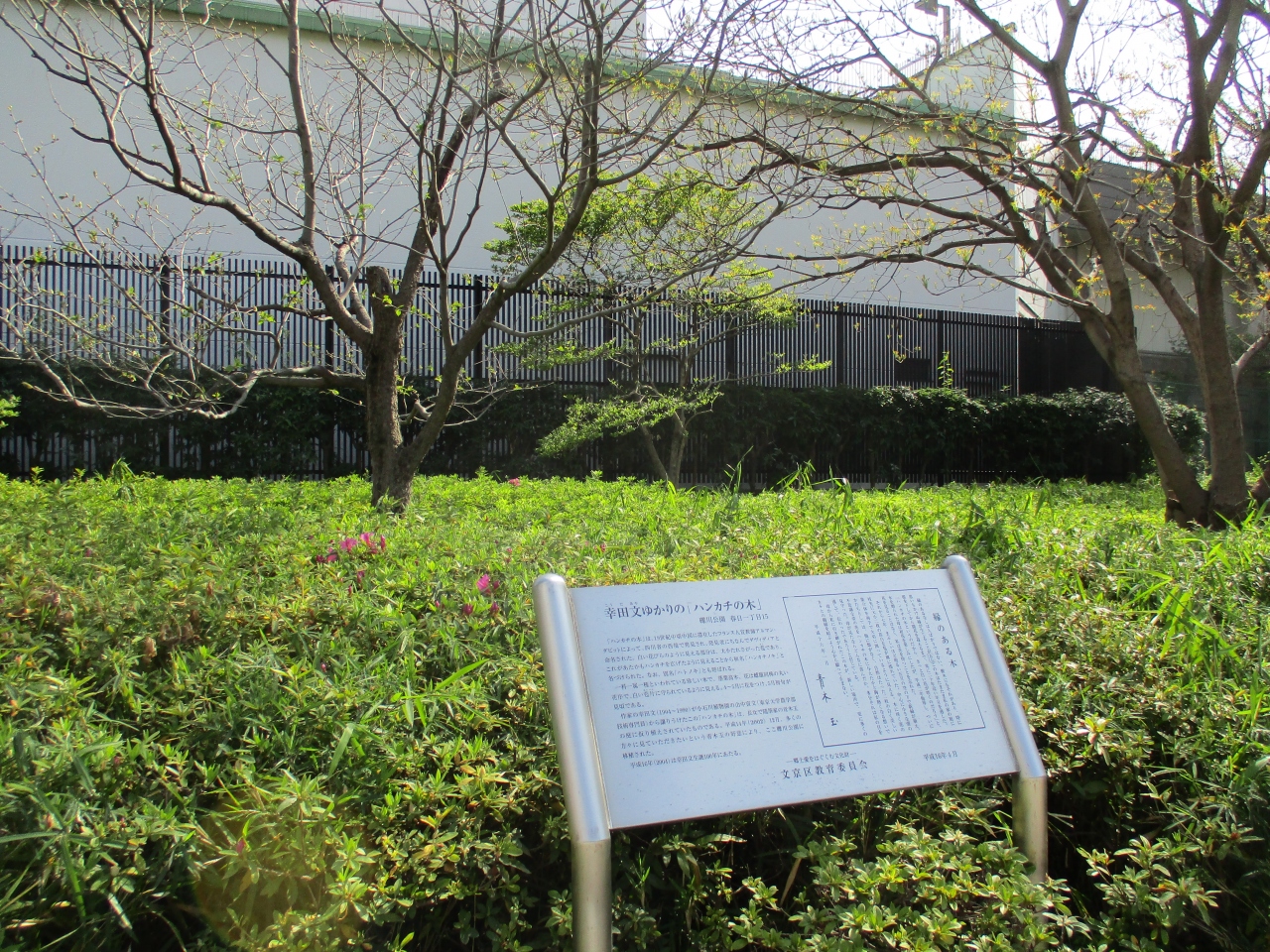 文京区の礫川公園内を散策していた時に、植栽の中に案内板が立てられていました。傍にハンカチの木が植えられていて、幸田文と所縁がある木だと記されていました。時期的に葉を落としていましたが、実際にハンカチの木のようになっているのを、是非見てみたいと思いました。