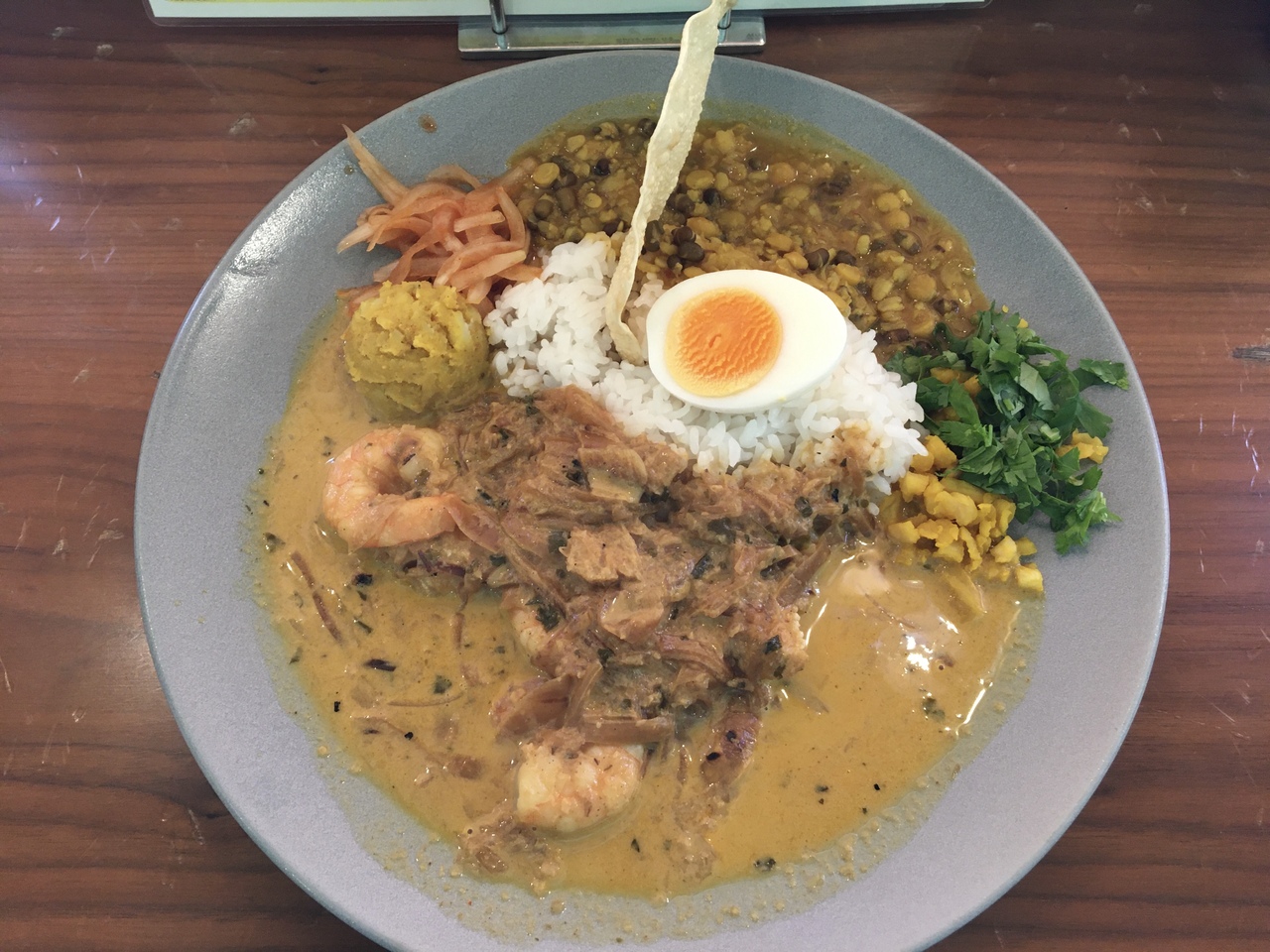 ゴールデンウィークの祝日、新宿駅西口から歩いてお店に向かいました。周りにはラーメン二郎など、ラーメン屋さんが多く、行列ができていました。11:30過ぎにお店に到着。お店の外に二人並んでいました。週替わりカレーは、白身魚とエビのカレーだったので、豆カレーとの2種盛りで、無料のちょこっこパクチーを付けてもらいました。ご飯の量も選べるのがありがたいです。カレー以外にも副菜がお皿に乗っていて混ぜながら味が変わるのを楽しんで食べました。
