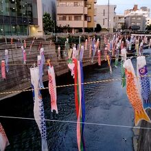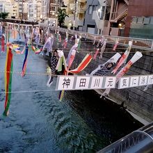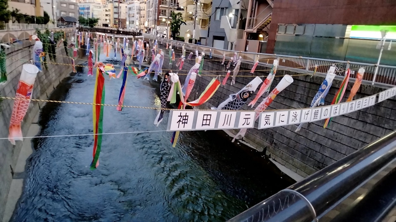 神高橋を渡っていると、向こうの歩道橋でカメラを構えた人がちらほら。川の上で鯉のぼりが泳いでいたので、引き返して、横断歩道を渡りなおし、歩道から鯉のぼりを鑑賞。「神田川 元気に泳げ 鯉のぼり」の横断幕といっしょに記念撮影。毎年やっているようです。高田馬場駅すぐ。JRや西武新宿線からも見えると思います。