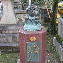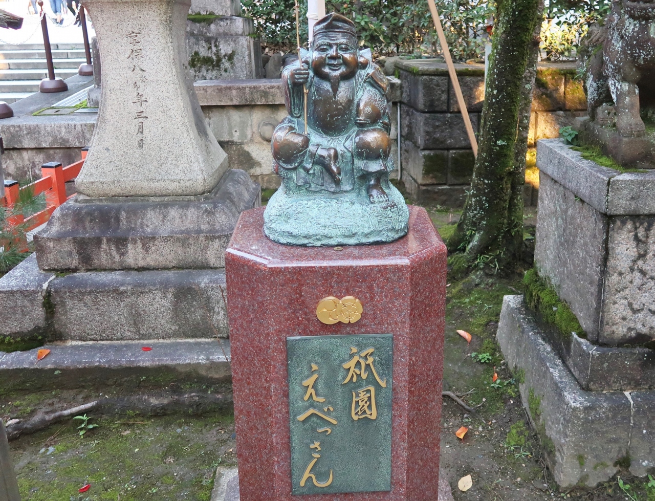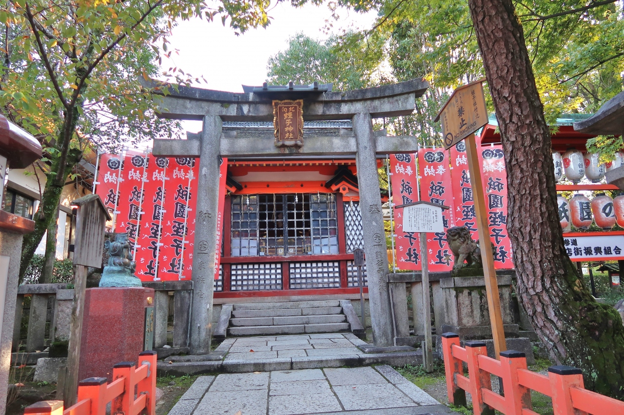 平安時代から八坂神社内に祀られ、祇園のえべっさんとして地元で親しまれてきた歴史ある末社です。1646年に建てられたという現在の建物も、八坂神社本殿と同じく、屋根の下に庇がありました。鳥居の左側には、直接触れることで、えびす様とのご縁が結べるえべっさんの像もありました。本殿の主祭神、素戔嗚尊のお孫さんにあたる神様でもあり、素戔嗚尊のお子さんにあたる向かいの大国主社も合わせた三社を新年に参拝すると、神様の家系三世代にわたるトリプルパワーのご神徳がいただけるそうです。