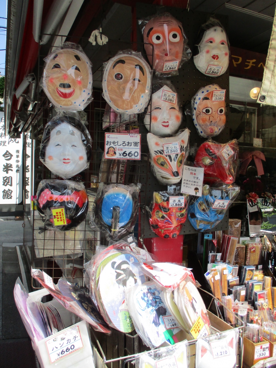浅草の浅草寺にお参りに行った時に、仲見世通りの中で、かつらやかんざしのお店があったので覗いてみました。あまり縁がない商品のお店でした。それよりも店頭に飾ってある、おかめ、ひょっとこ、赤鬼、青鬼などのお面は、縁日で買うお面よりも数段良くできたお面だと思いました。