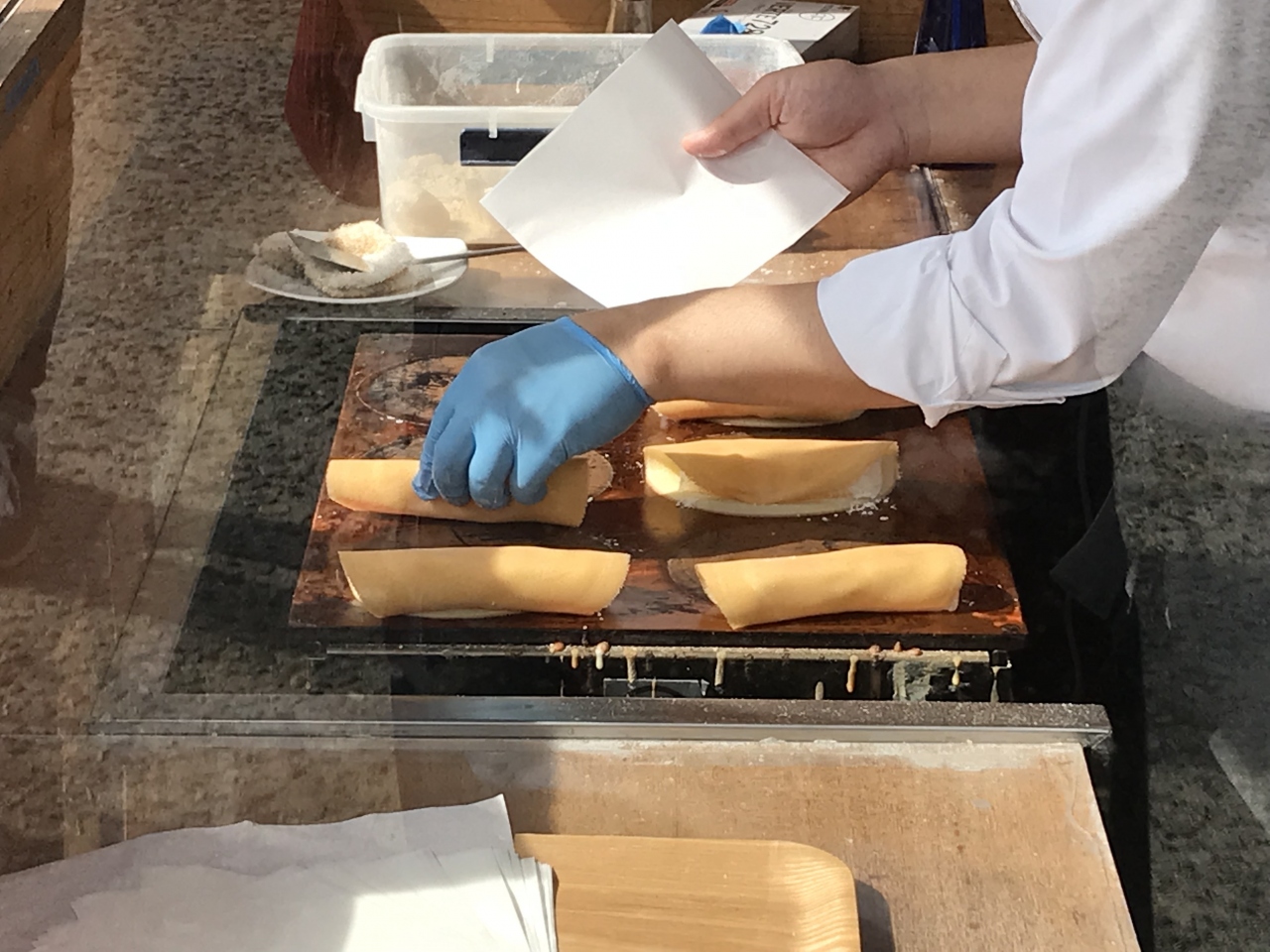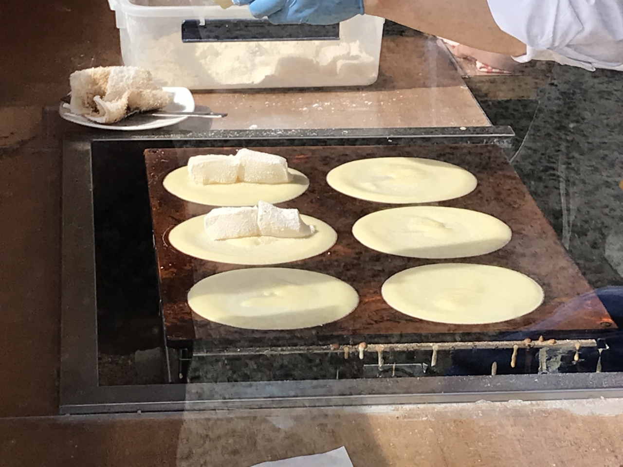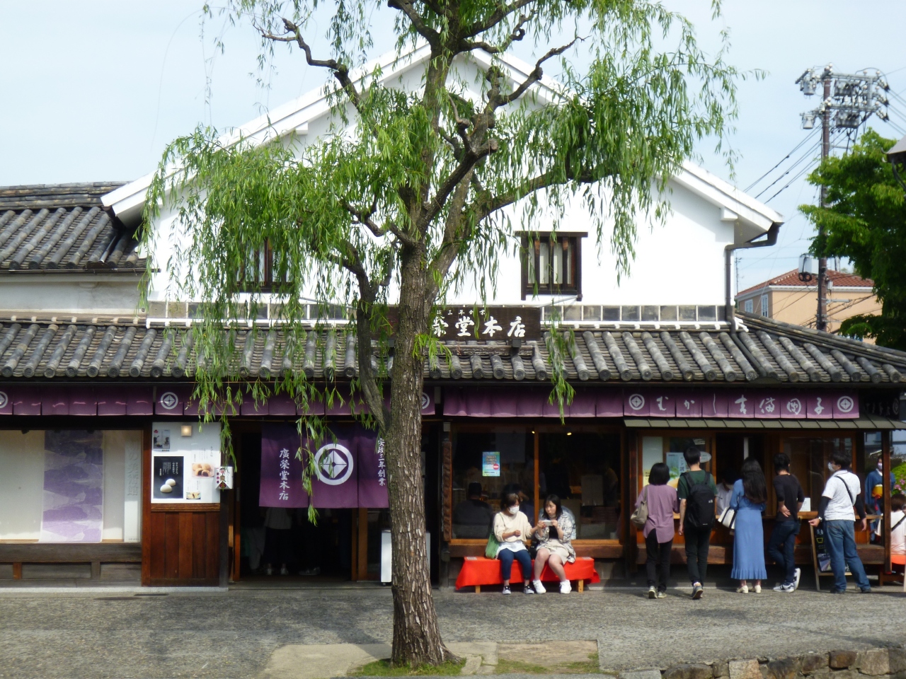 廣榮堂 倉敷雄鶏店は、美観地区の端、高砂橋の辺りにあります。店先で調布を実演販売していました。焼きたての調布を頂けるので多くの方が並んで待っていました。ほんのりと温かく、ふわっとした軽い食感の皮に中の求肥はとても柔かでほのかな甘さが広がる上品な味で、とてもおいしかったです。