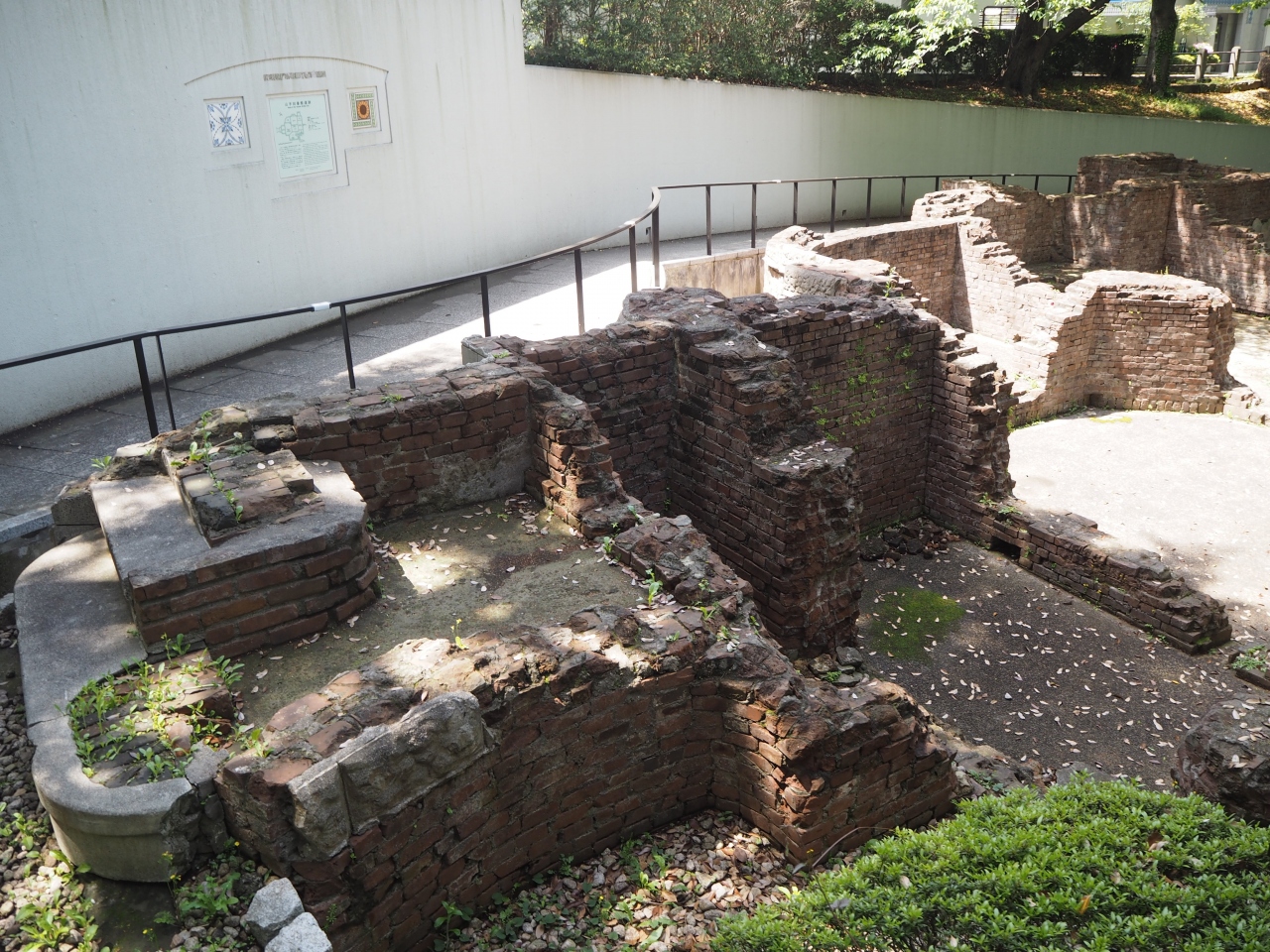横浜山手の元町公園のエリスマン邸から元町公園の木々の間の道を降りて行くと、レンガやコンクリートがむき出しになった家の土台があります。これが山手80番館遺跡です。この邸宅跡はフランス人の貿易商が建てた建物で、関東大震災でこのような姿になったようです。震災前の邸宅の間取りなどがわかるようです。