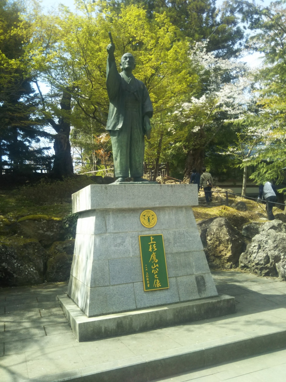 山形県米沢市は上杉家にゆかりのある土地で駅からは少し離れていますが、上杉神社があります。かの名言を残した上杉鷹山の銅像があります。座っている像とどこかを指している立ち像がありました。なんでもやってみないと達成はできないものだなあと感銘しました。