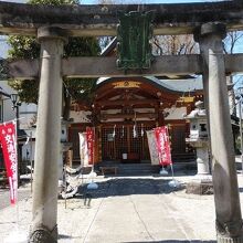 駅前の通りに面した神社で、周辺は商業地域となっておりビルなども建ち並ぶ立地となっている。