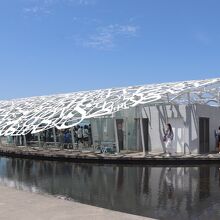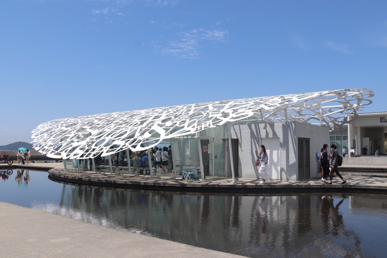 フェリーが島に到着すると、山腹に広がる集落の手前に目立つ白い屋根のような建物があります。芸術作品のひとつでもあり、白い屋根には8か国の言語が表現されています。館内は観光案内所やきっぷ売場になっていました。