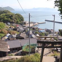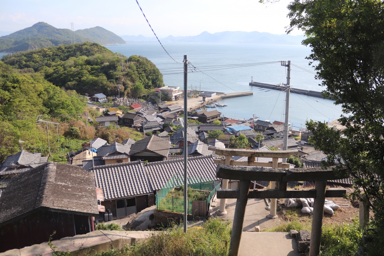 フェリーターミナルから3つの鳥居をくぐりぬけていきます。男木島の集落の一番上にある島を守る神社です。豊玉姫を祀っており、安産の神様でもあります。長い石段がつづき登るのもたいへんでしたが、眼下には男木島の街並みや瀬戸内海を眺めることができました。