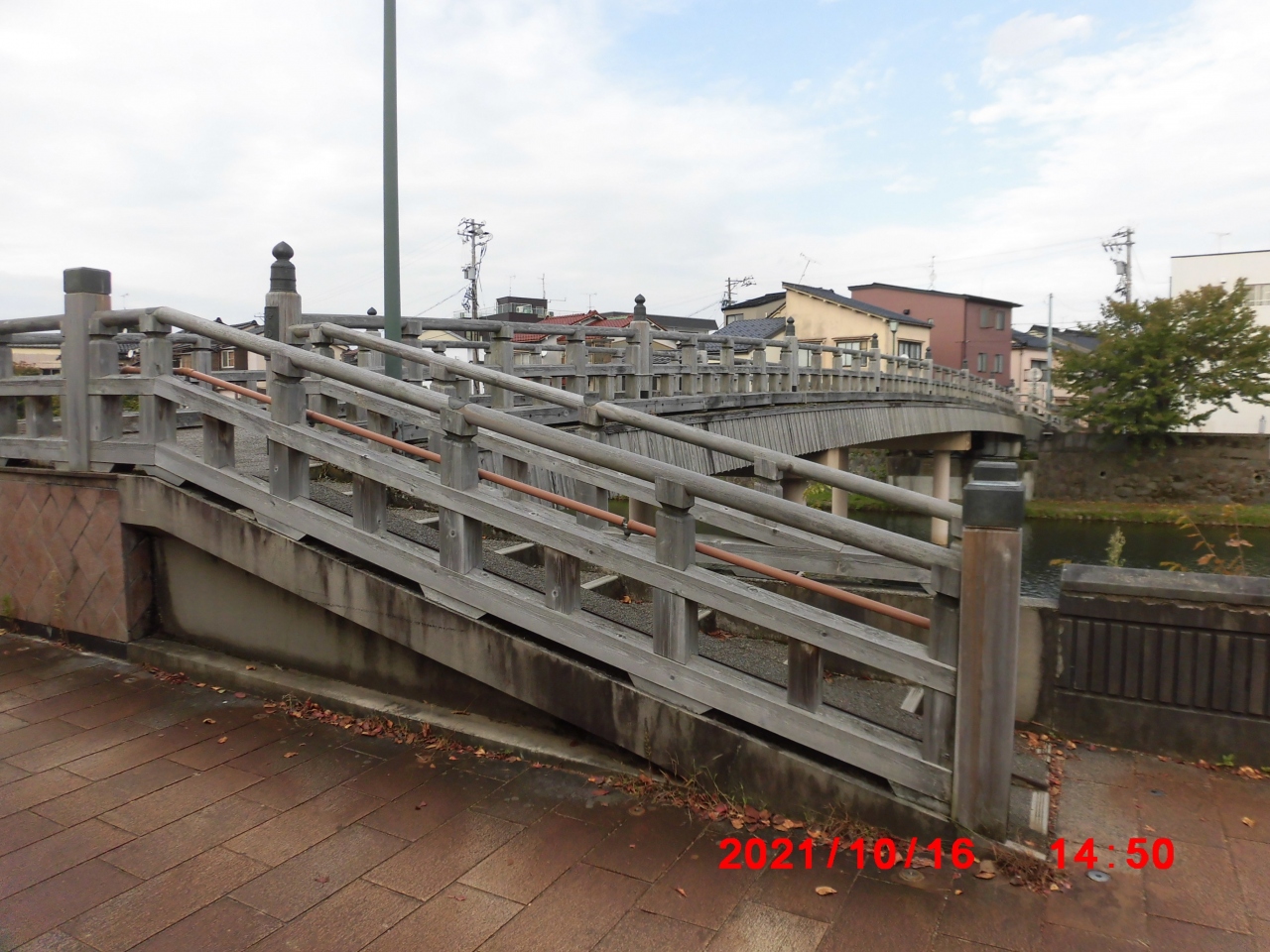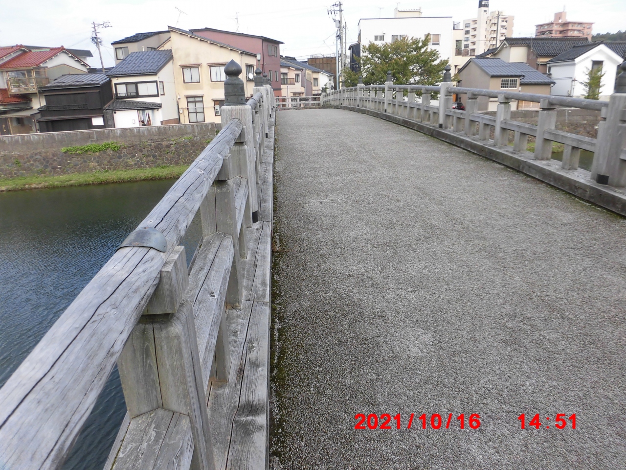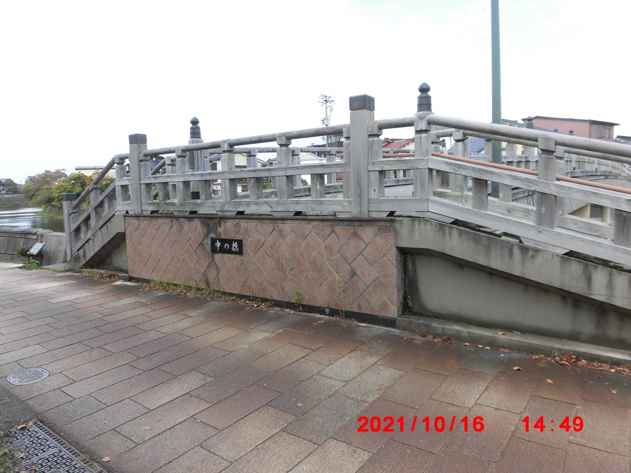 金沢市観光で立ち寄りました。中の橋は、浅野川に架かる橋で、浅野川大橋の北西にあります。橋の両岸にはそれぞれ名前が付いていて、南岸は「鏡花のみち」、北側は「秋聲のみち」と表示されてました。中の橋の両サイドの出入り口は階段になっているので、自転車を持ちあげるのは厳しそうなので、純粋な人道橋でした。