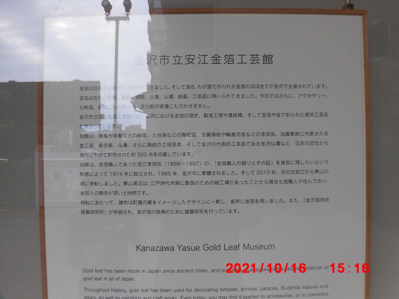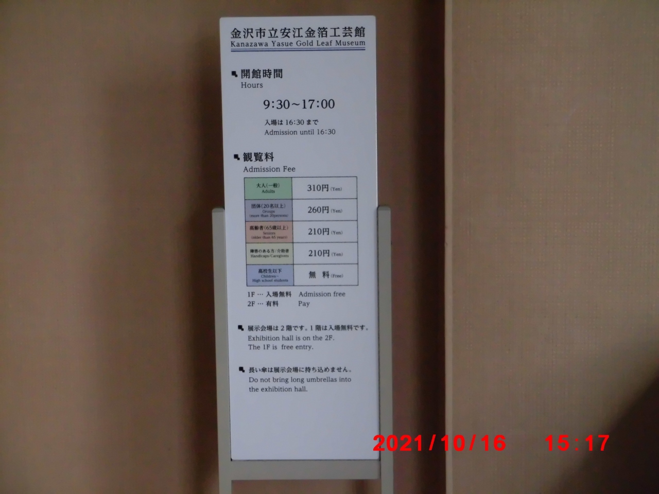 金沢市観光で立ち寄りました。金沢市立安江金箔工芸館は、浅野川大橋から北東に3分程城北大通りを進んだところにある大きな建物です。金箔を使った絢爛豪華な美術工芸品を鑑賞できる博物館です。国内で作られるほぼ全ての金箔が金沢で生産されているきらびやかな場所です。