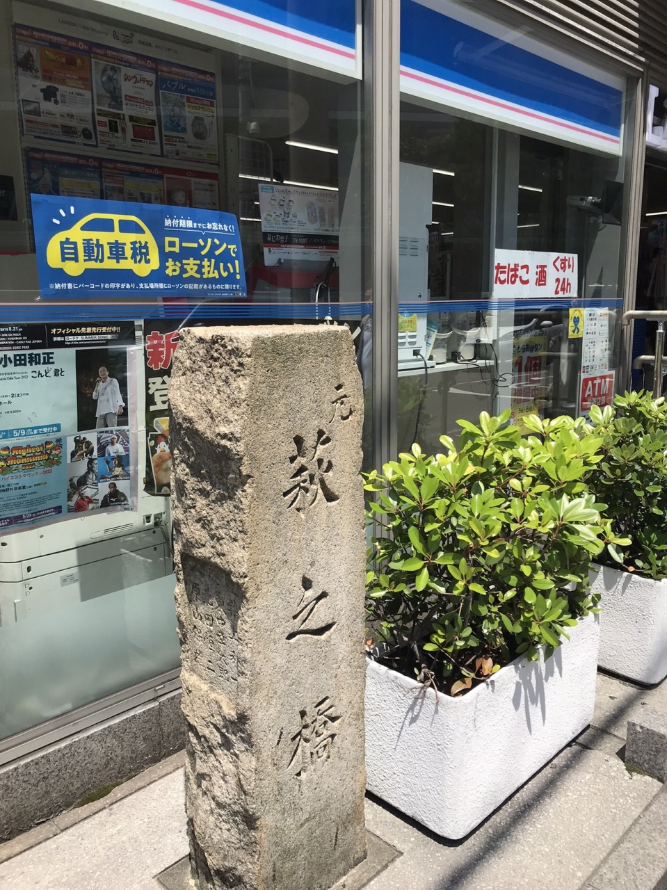 能勢街道は、中津から池田市を経由して亀岡に至る街道です。石橋の商店街の入り口には、大きく「能勢街道」と書かれています。中津駅の近くのローソンの前に、「元萩之橋」と書かれた石碑を見つけました。石橋商店街からここまで続いていた証拠ですね。