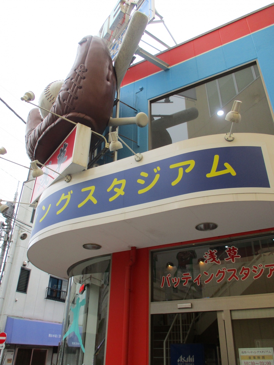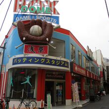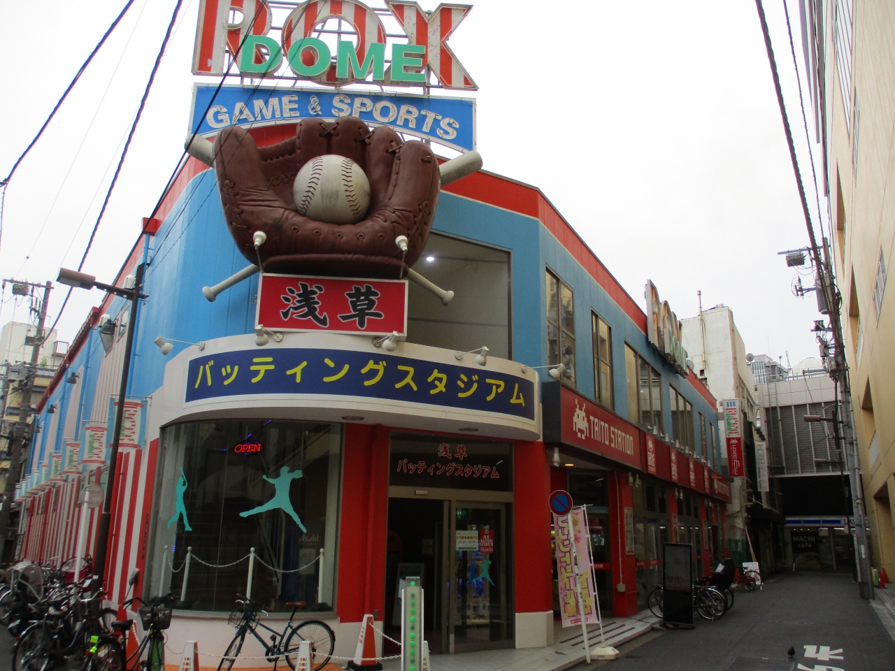 浅草の六区近辺を散策していた時に、バッティンッグセンターを見つけました。ゲームセンターも併設していて、とにかく建物の外観がとても派手な装飾に彩られていました。大きなグローブとボール、バットが壁面に付いていてアピール度満点でた。探す時に目印になると思いました。