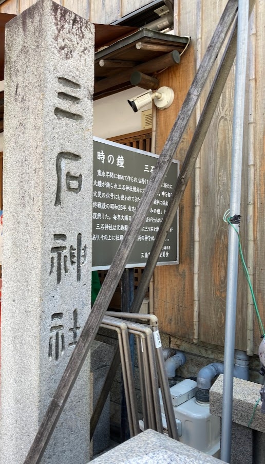 源兵衛川沿いを散策途中、すごい人混みがあり、うなぎの桜屋さんの順番待ちのかたで、ちょうどそのあたりに時の鐘と、三石神社がありました。