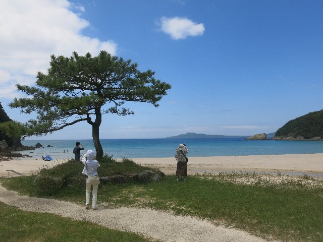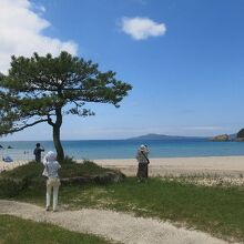 その輝くほどの砂浜を取り囲むように連なる山々の緑、波打ち際から水色、青色、藍色となっていく