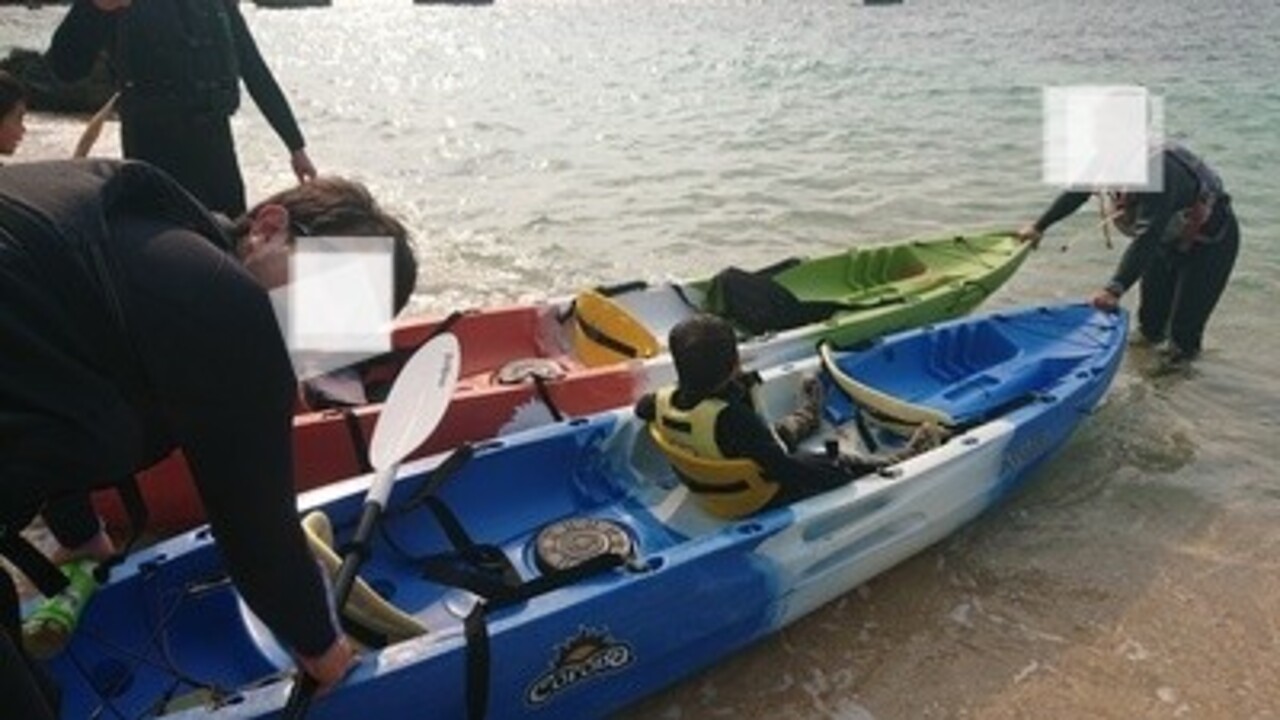 ビーチで記念撮影ののち、我々は3人乗りのカヤックへ