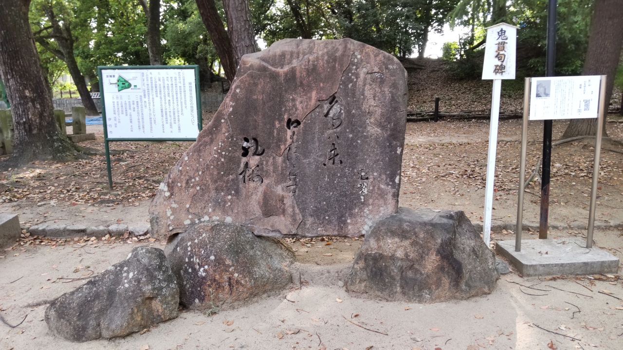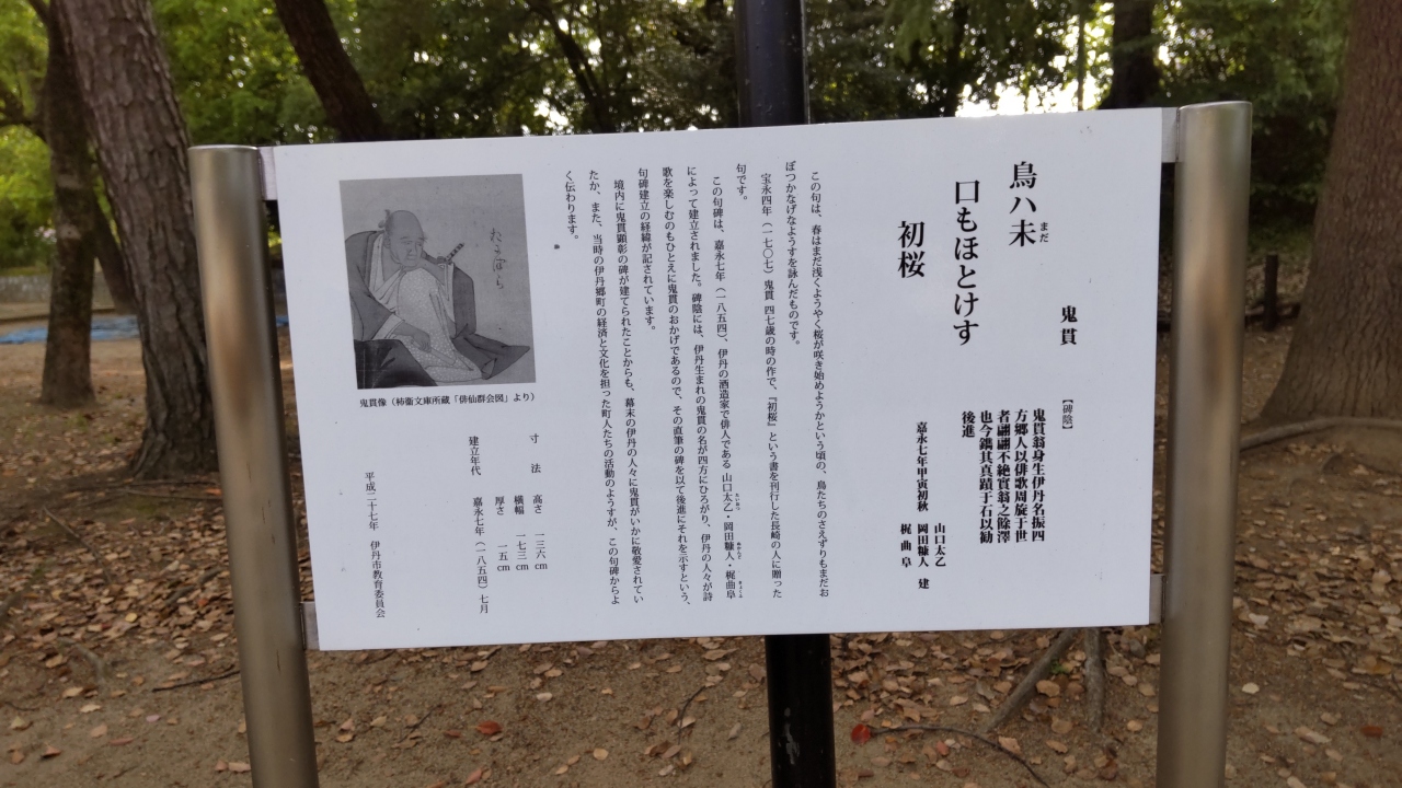 猪名野神社は、阪急伊丹駅から徒歩10分くらいのところに鎮座する大きな神社です。境内に有岡城の岸の砦があるとのことで訪れました。岸の砦の説明書は参道にありました。又、境内に伊丹出身の江戸時代中期の俳人「鬼貫」の句碑がありました。大きな自然石に「鳥ハ未 口もほどけず 初桜」と刻まれていました。伊丹市内には、鬼貫の句碑がいくつかありますので興味がる方は巡られては如何でしょうか。