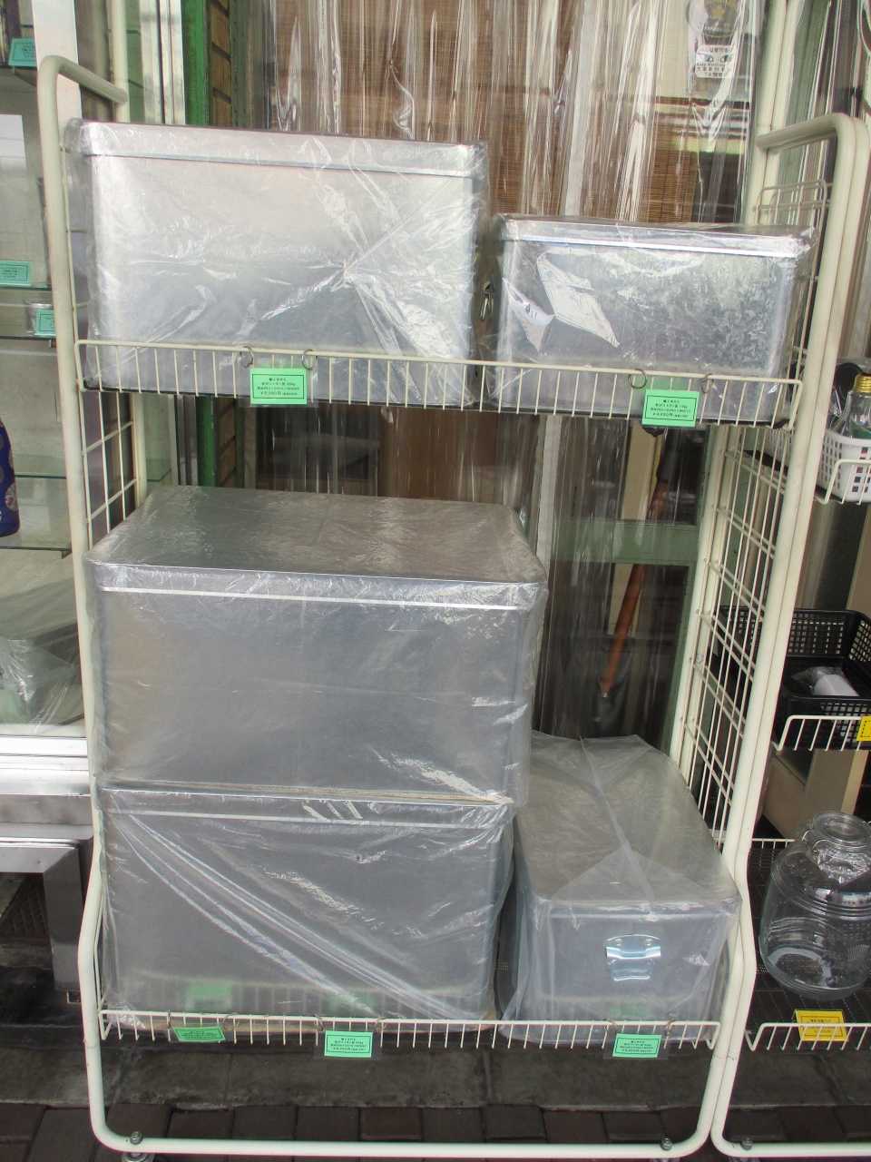合羽橋道具街のお店巡りをしていた時に、缶専門のお店があったので覗いてみました。店頭に並べてある商品の中で、手打ちのトタン板の米びつがあって、とても懐かしく思いました。他にもカラフルな茶筒などもあって、玄人好みの楽しいお店でした。