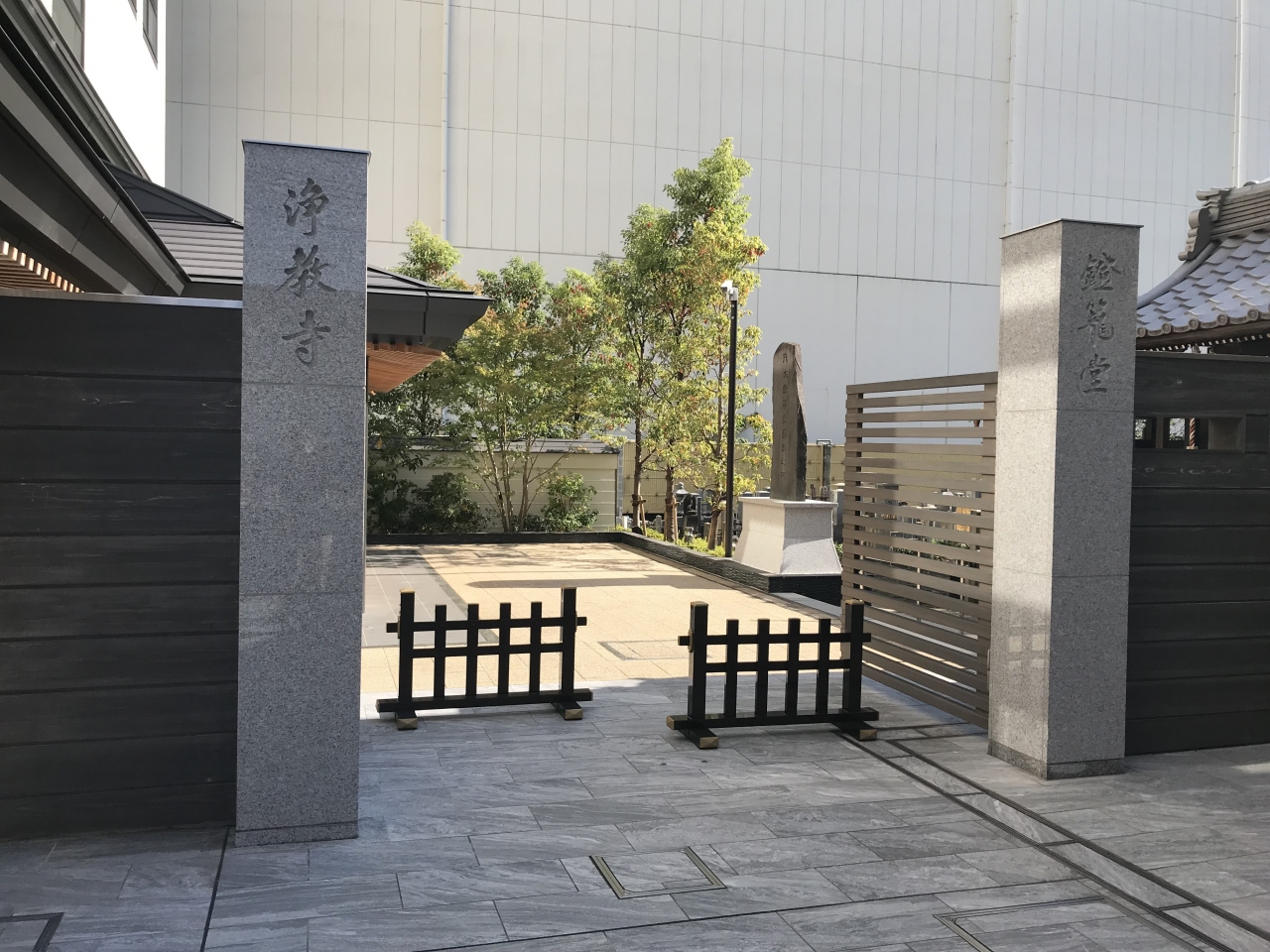 浄教寺は、阪急電車「京都河原町」から南西の方法へ徒歩3分くらいの場所にあり、浄土宗の寺院です。参拝に立ち寄って見ると寺院がホテルと一体化していてびっくりしました。三井ガーデンホテル京都河原町浄教寺というホテル経営もされているようです。したがって本堂はホテルに組み込まれていました。ホテル宿泊者は朝のお勤め体験、お堂見学などができるようです。境内には歴史が感じられる平重盛の石碑と比較的新しい青銅の立派な燈籠がありました。