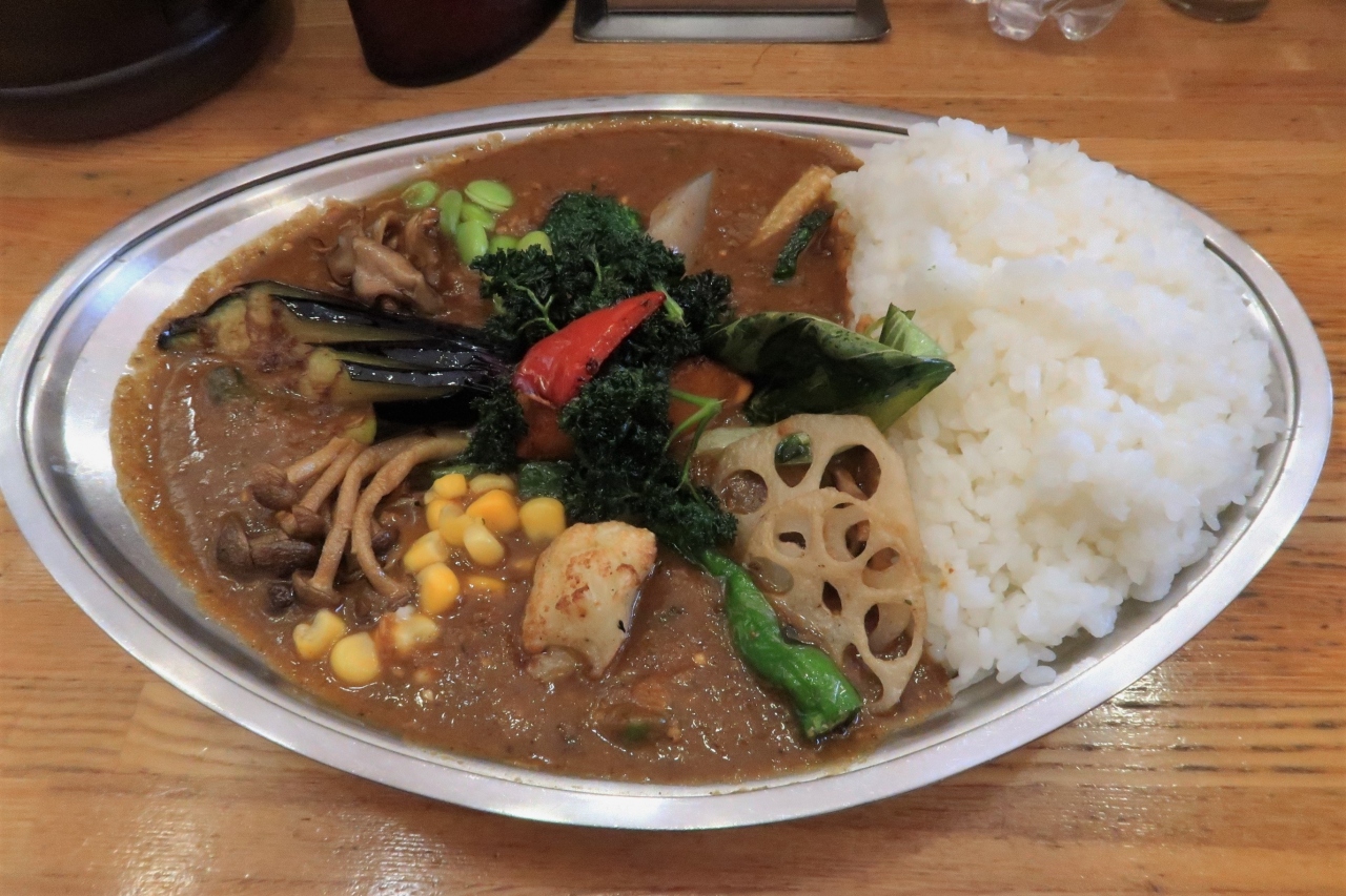 ●野菜カレー レギュラーだとかなりボリューミー。そして沢山の野菜が綺麗に盛り付けられており、蓮根、人参、青菜、キャベツ、オクラ、カリフラワー、じゃがいも、コーン、しめじ、茄子、パプリカ、パセリ、舞茸、枝豆、ブロッコリー、南瓜、ズッキーニ、ヤングコーン、コンニャクなど。ほとんどが素揚げされているので、味に凝縮感があり、それぞれの食感の変化も楽しい。ベースのカレーには鰹節、昆布、椎茸が使われているとの事で味に深みと甘みがあり、それがスパイスと見事に融合していて非常に美味しい。辛味は後からじんわりと襲ってきますが、3だと食べやすい辛さ。スパイシーなのに、やさしい味わいという他では中々ないカレーでした。