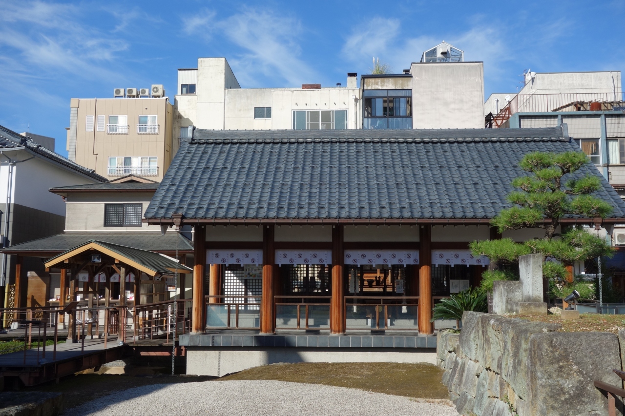 立てられた神社で、発掘調査の結果見つかった、城の石垣の
