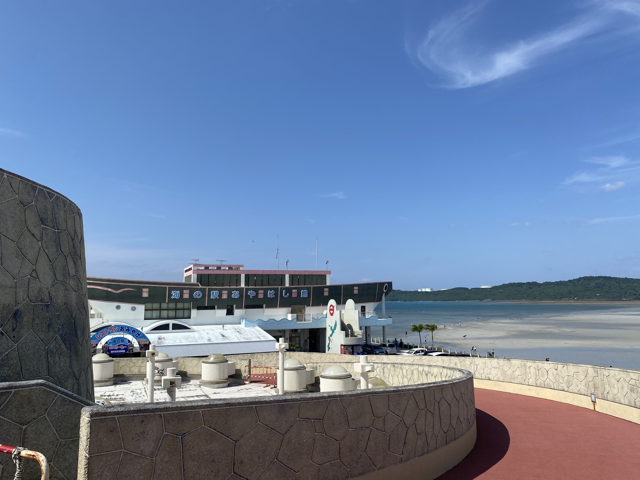 那覇空港から車で約1時間30分。伊計島などの島々を繋ぐ海中道路のちょうど間にある海の駅です。駅ほ一階には飲食店やお土産屋さんが入っており、2階は海の文化資料館か入ってます。2階の展望スペースからはコバルトブルーの絶景も堪能できますよ~