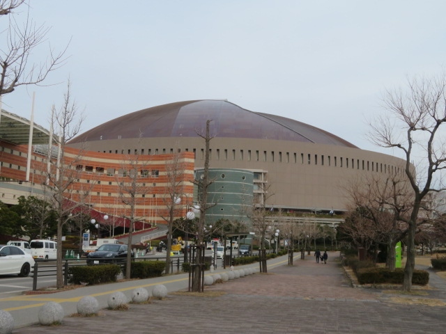 コロナ流行下の2021年の1月ということで、静かなドームでした。正面から見るとわかりませんが、裏から見ると、オレンジと白の壁とドームのこげ茶の壁のコントラストがヨーロッパ調で、開閉する屋根の形もよく見えました。