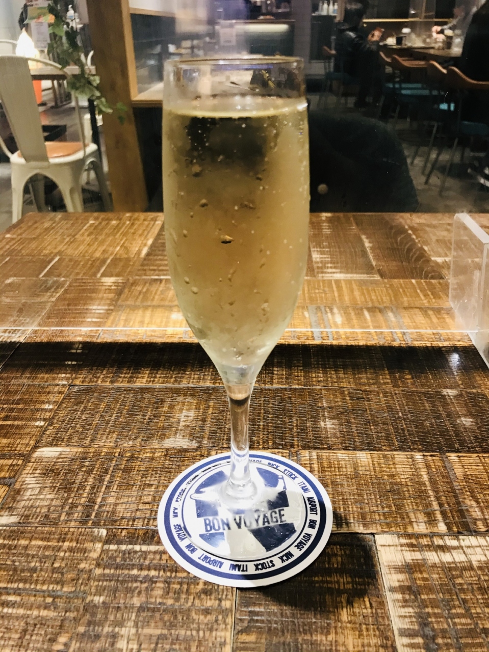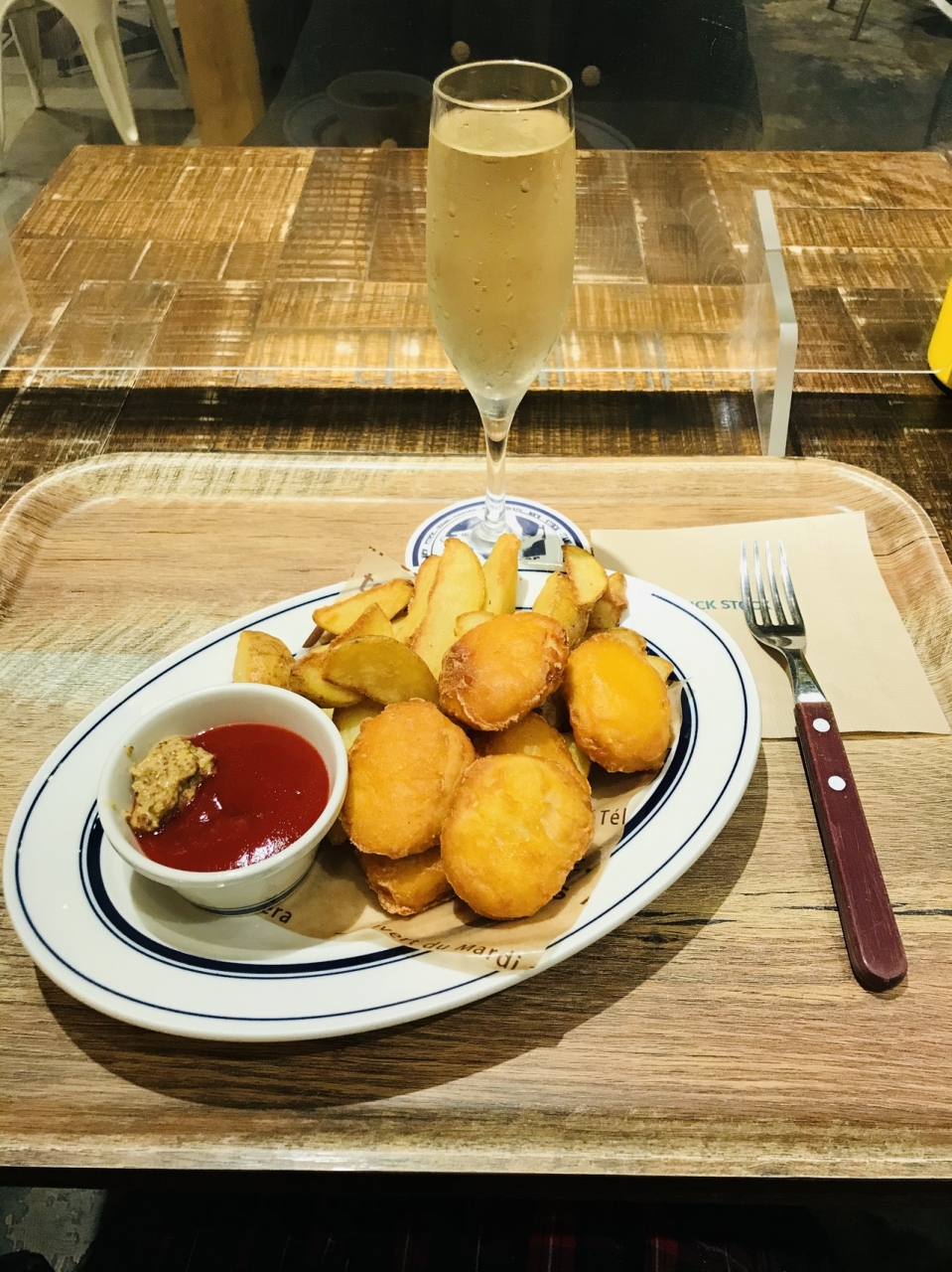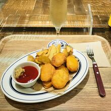 しばらくしてスパークリングワインを持ってきてくれたのですが、その直後にブザーが鳴ってポテト&ナゲットを取りに行きました。