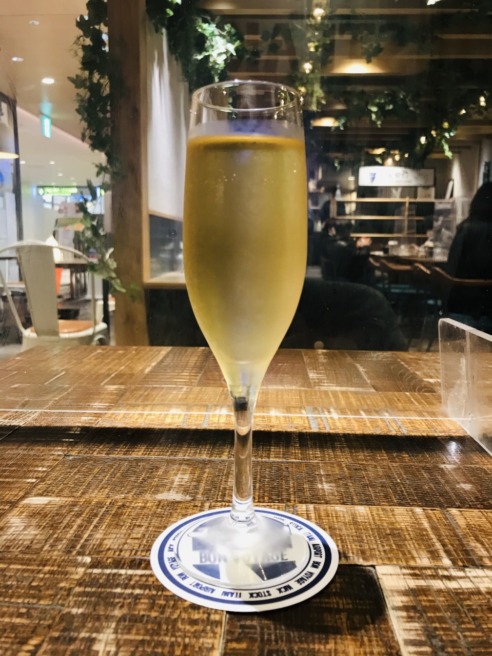 今回はポテト&ナゲットとスパークリングワインをオーダーしましたが、先に渡されたスパークリングワインを飲んでみると白ワイン・・・