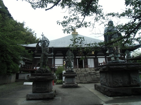 本堂前に大きな日蓮聖人像や四天王像が林立していて、戦隊もののテレビのオープニングのようで面白い眺めです。