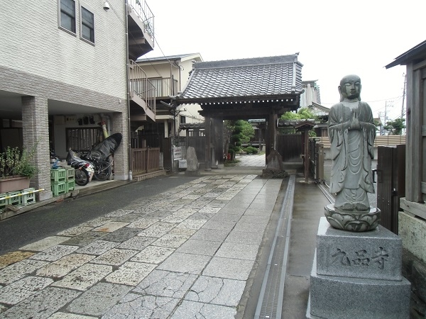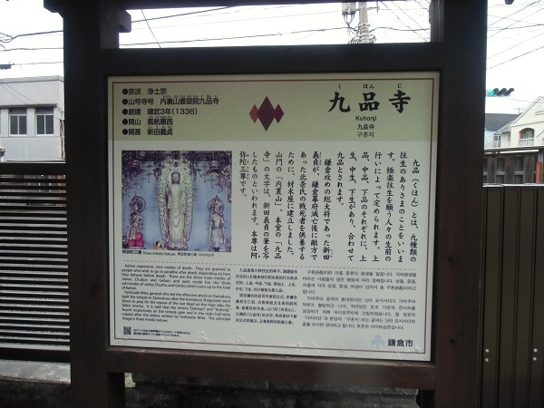 説明板によると、九品寺は、鎌倉攻めの総大将であった新田義貞が、鎌倉幕府滅亡後に敵方であった北条氏の戦死者を供養するために、材木座に建立しました。